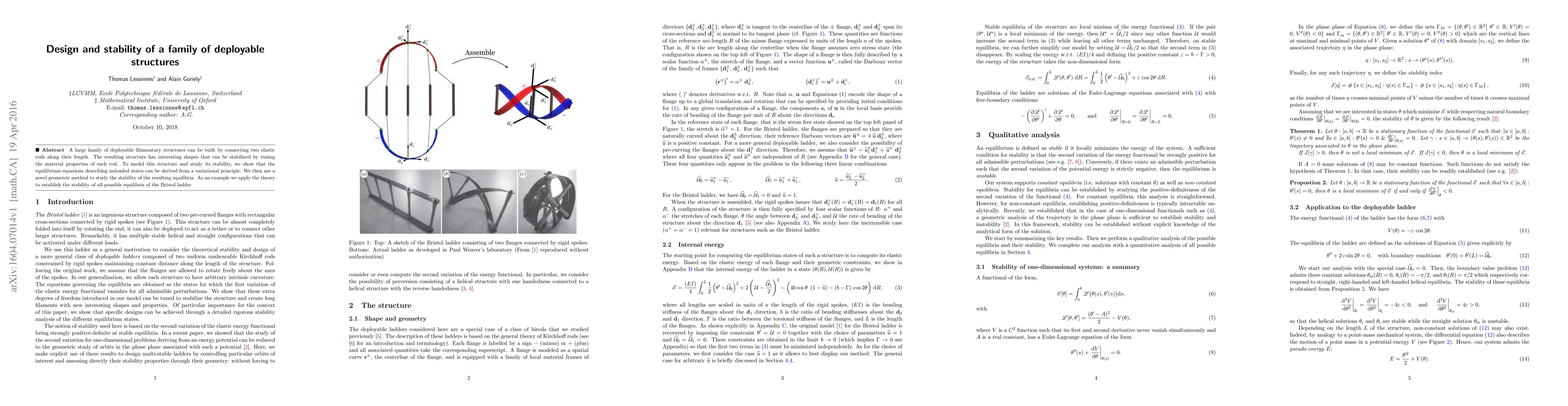 A large family of deployable filamentary structures can be built by connecting two elastic rods along their length. The resulting structure has interesting shapes that can be stabilized by tuning the material properties of each rod. To model this structure and study its stability, we show that the equilibrium equations describing unloaded states can be derived from a variational principle. We then use a novel geometric method to study the stability of the resulting equilibria. As an example we apply the theory to establish the stability of all possible equilibria of the Bristol ladder.
