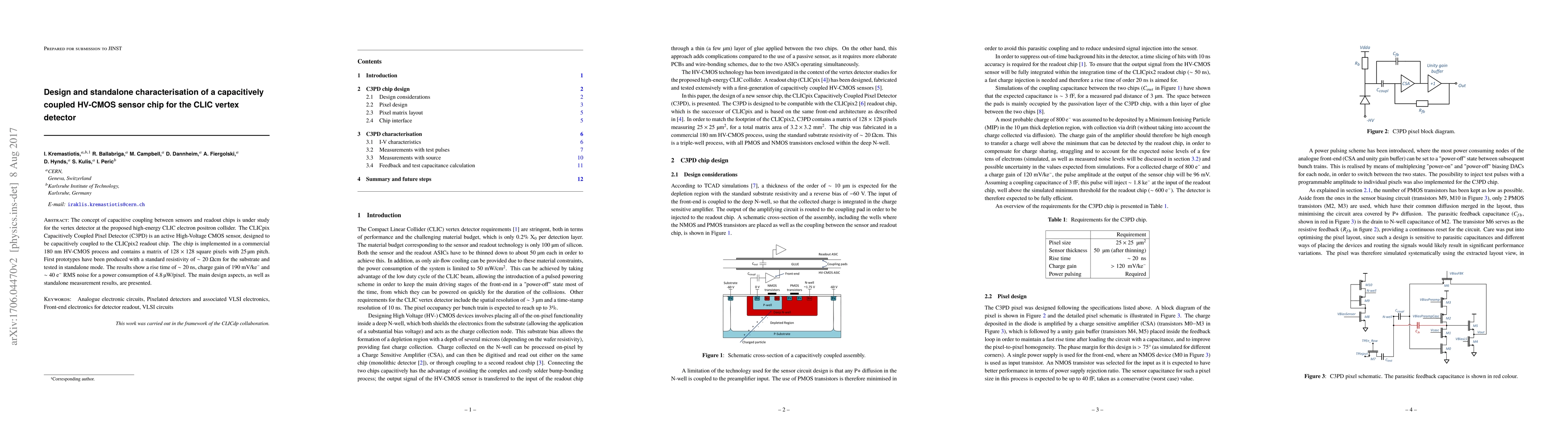 This paper presents the design and standalone characterization of a capacitively coupled high-voltage CMOS sensor chip for the CLIC vertex detector, featuring a $128\times128$ pixel matrix with $25$ $\mu$m pitch, achieving a rise time of $\sim20$ ns and a charge gain of $190$ mV/ke$^{-}$.