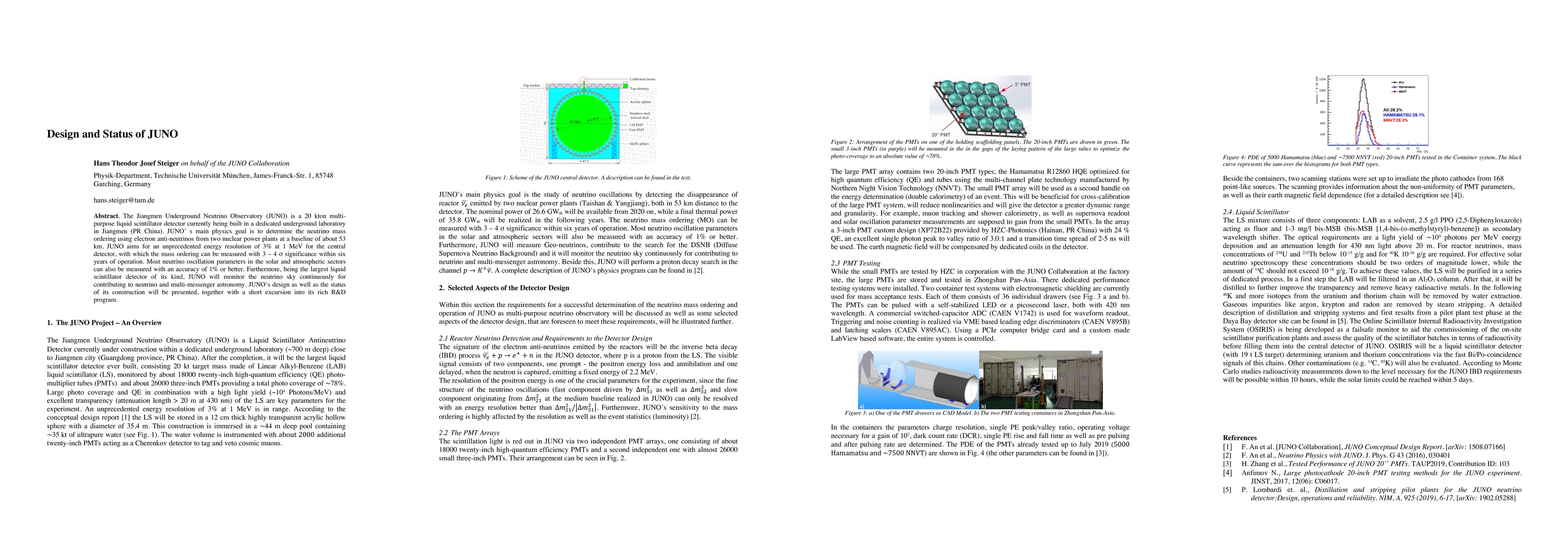 The Jiangmen Underground Neutrino Observatory (JUNO) is a 20 kton liquid scintillator detector designed to determine neutrino mass ordering with high precision and measure various neutrino oscillation parameters. Construction is ongoing, with plans for operational readiness within six years.