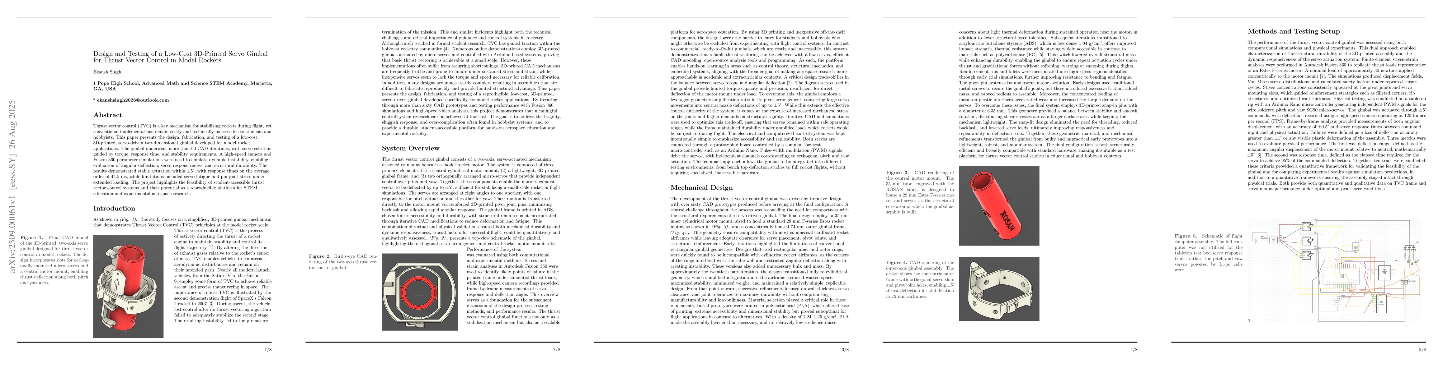 Thrust vector control (TVC) is a key mechanism for stabilizing rockets during flight, yet conventional implementations remain costly and technically inaccessible to students and hobbyists. This paper presents the design, fabrication, and testing of a low-cost, 3D-printed, servo-driven two-dimensional gimbal developed for model rocket applications. The gimbal underwent more than 60 CAD iterations, with servo selection guided by torque, response time, and stability requirements. A high-speed camera and Fusion 360 parameter simulations were used to emulate dynamic instability, enabling evaluation of angular deflection, servo responsiveness, and structural durability. The results demonstrated stable actuation within plus or minus 5 degrees, with response times on the average order of 44.5 ms, while limitations included servo fatigue and pin-joint stress under extended loading. The project highlights the feasibility of student-accessible thrust vector control systems and their potential as a reproducible platform for STEM education and experimental aerospace research.