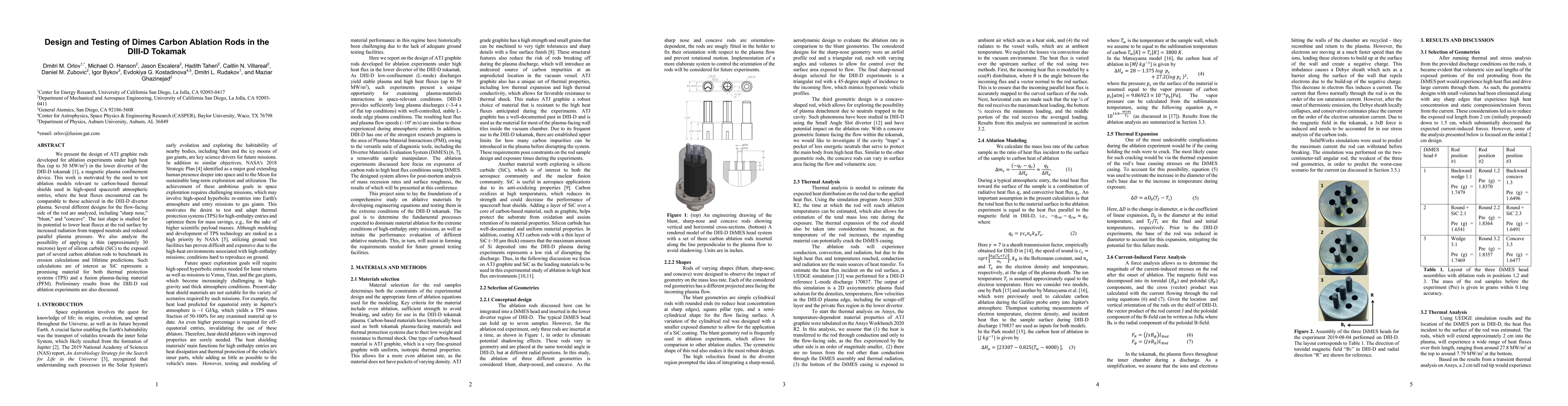 This paper details the design and testing of ATJ graphite rods for ablation experiments in the DIII-D tokamak under extreme heat flux conditions, aiming to validate models for carbon-based thermal shields in high-speed spacecraft reentries. Various rod designs, including "sharp nose," "blunt," and "concave," are analyzed for their ablation performance, with a focus on SiC coating for enhanced erosion resistance and lifetime predictions.