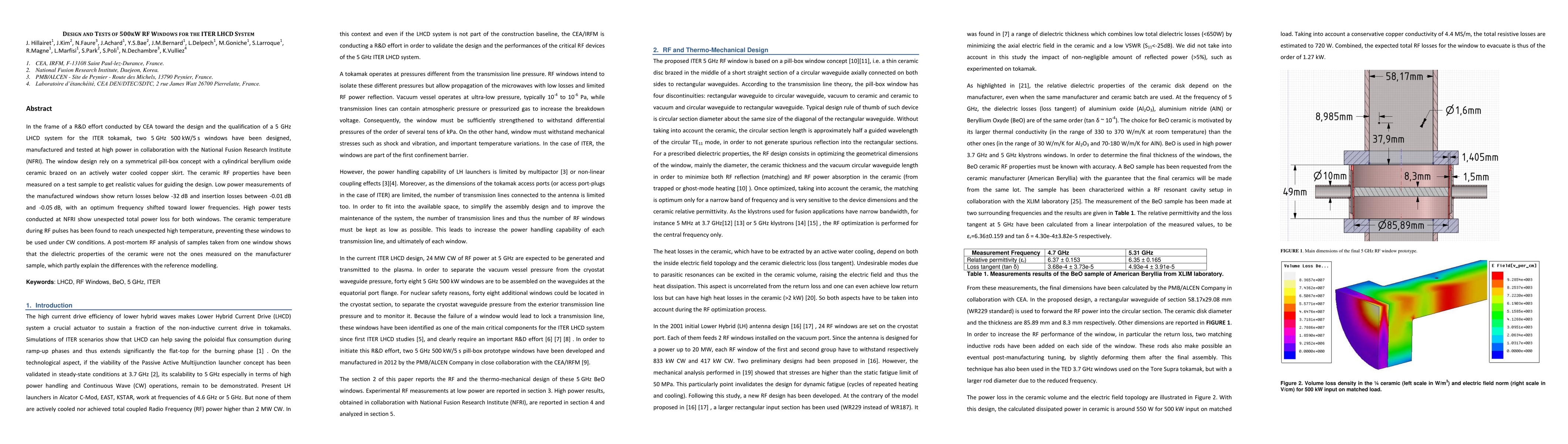 Researchers designed and tested 500kW RF windows for ITER's LHCD system, but high power tests showed unexpected total power loss due to ceramic temperature issues, preventing them from being used under continuous wave conditions.