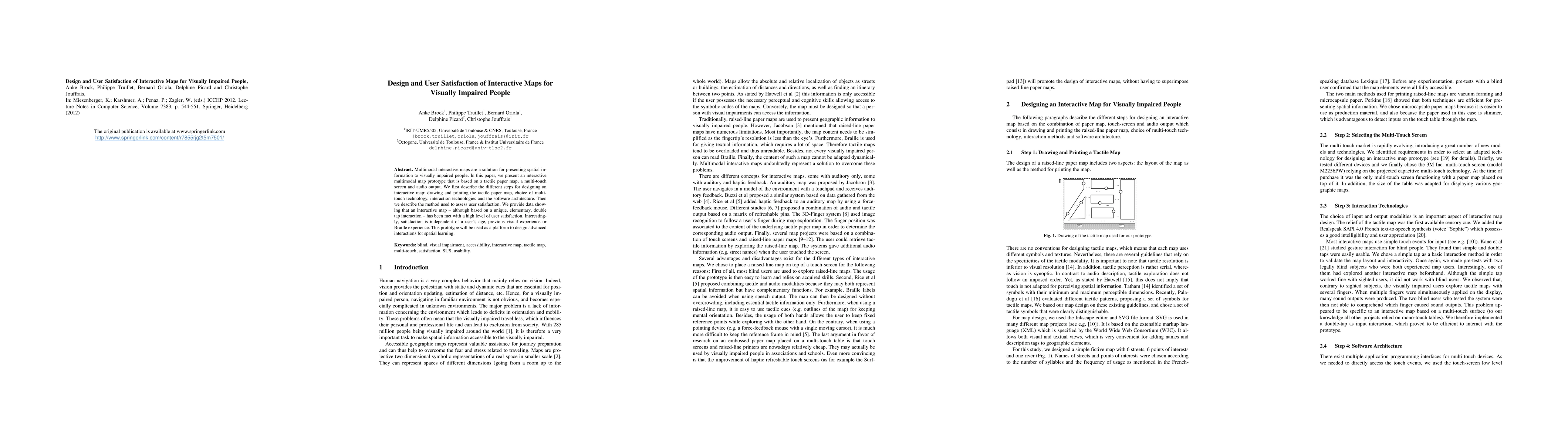 This paper presents a multimodal interactive map prototype for visually impaired people, combining tactile paper maps, multi-touch screens, and audio output. The study shows high user satisfaction, independent of user age, visual experience, or Braille familiarity, indicating potential for advanced spatial learning interactions.