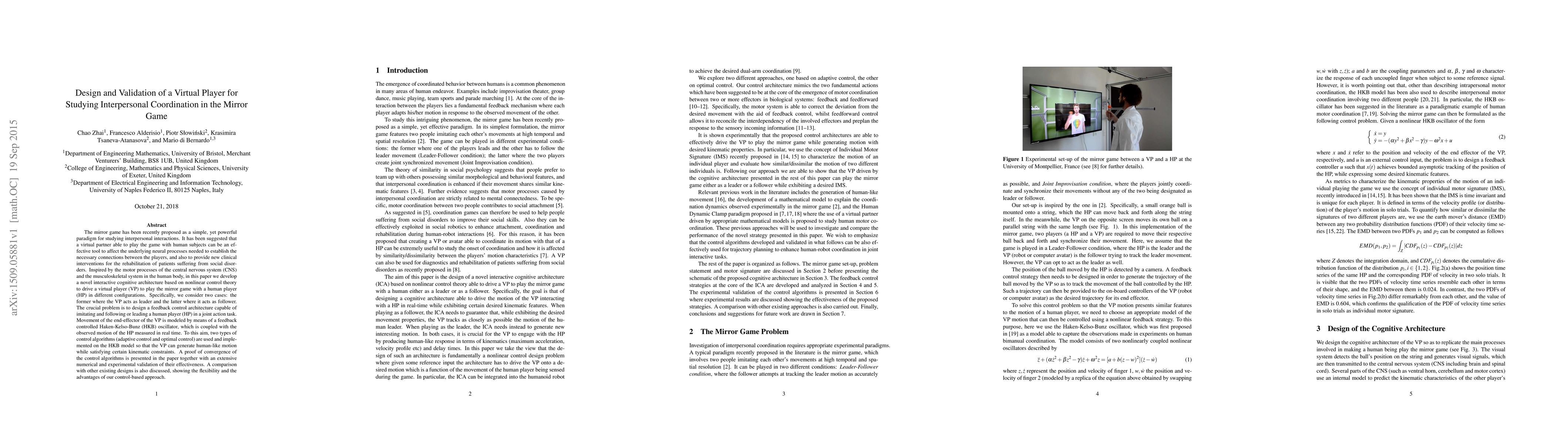 The mirror game has been recently proposed as a simple, yet powerful paradigm for studying interpersonal interactions. It has been suggested that a virtual partner able to play the game with human subjects can be an effective tool to affect the underlying neural processes needed to establish the necessary connections between the players, and also to provide new clinical interventions for the rehabilitation of patients suffering from social disorders. Inspired by the motor processes of the central nervous system (CNS) and the musculoskeletal system in the human body, in this paper we develop a novel interactive cognitive architecture based on nonlinear control theory to drive a virtual player (VP) to play the mirror game with a human player (HP) in different configurations. Specifically, we consider two cases: the former where the VP acts as leader and the latter where it acts as follower. The crucial problem is to design a feedback control architecture capable of imitating and following or leading a human player (HP) in a joint action task. Movement of the end-effector of the VP is modeled by means of a feedback controlled Haken-Kelso-Bunz (HKB) oscillator, which is coupled with the observed motion of the HP measured in real time. To this aim, two types of control algorithms (adaptive control and optimal control) are used and implemented on the HKB model so that the VP can generate human-like motion while satisfying certain kinematic constraints. A proof of convergence of the control algorithms is presented in the paper together with an extensive numerical and experimental validation of their effectiveness. A comparison with other existing designs is also discussed, showing the flexibility and the advantages of our control-based approach.