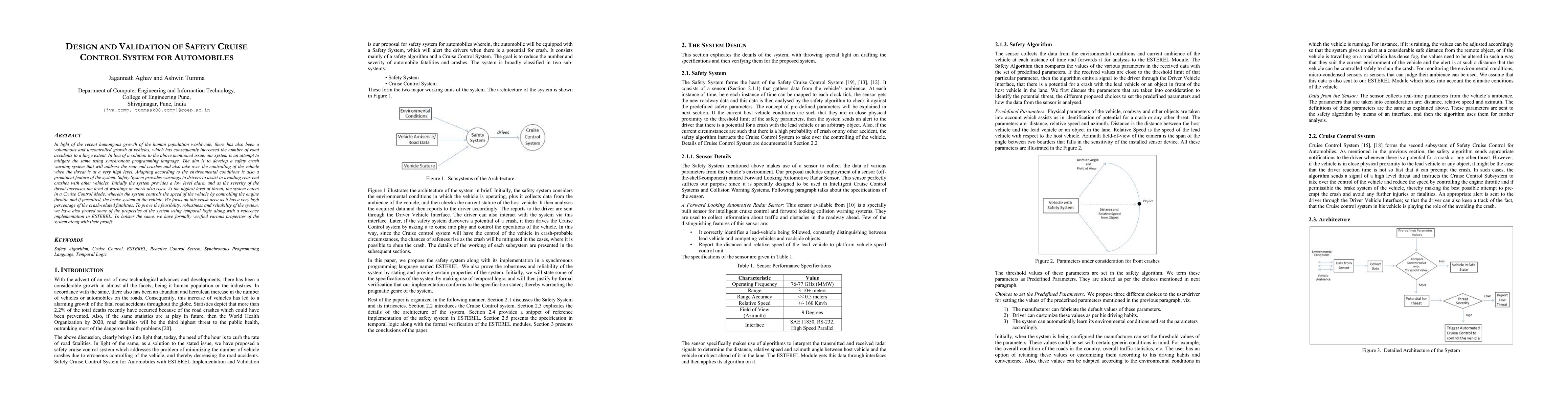 A safety cruise control system was designed to mitigate rear-end crashes by providing warnings and taking control of vehicles at high threat levels. The system's feasibility and properties were formally verified using temporal logic.