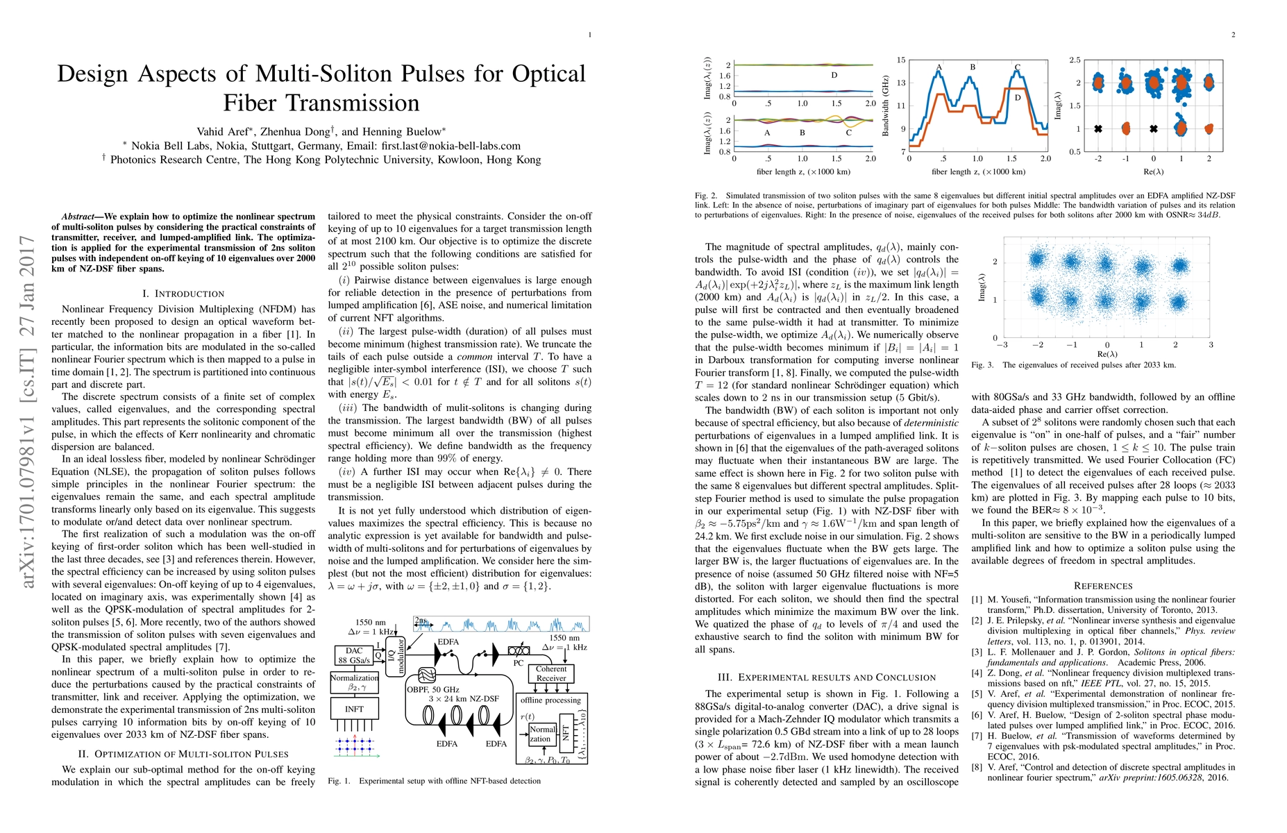 This paper optimizes the nonlinear spectrum of multi-soliton pulses for optical fiber transmission, considering practical constraints of transmitter, receiver, and amplified links. Experimental results demonstrate successful 2 ns soliton pulse transmission over 2000 km of NZ-DSF fiber with independent on-off keying of 10 eigenvalues.