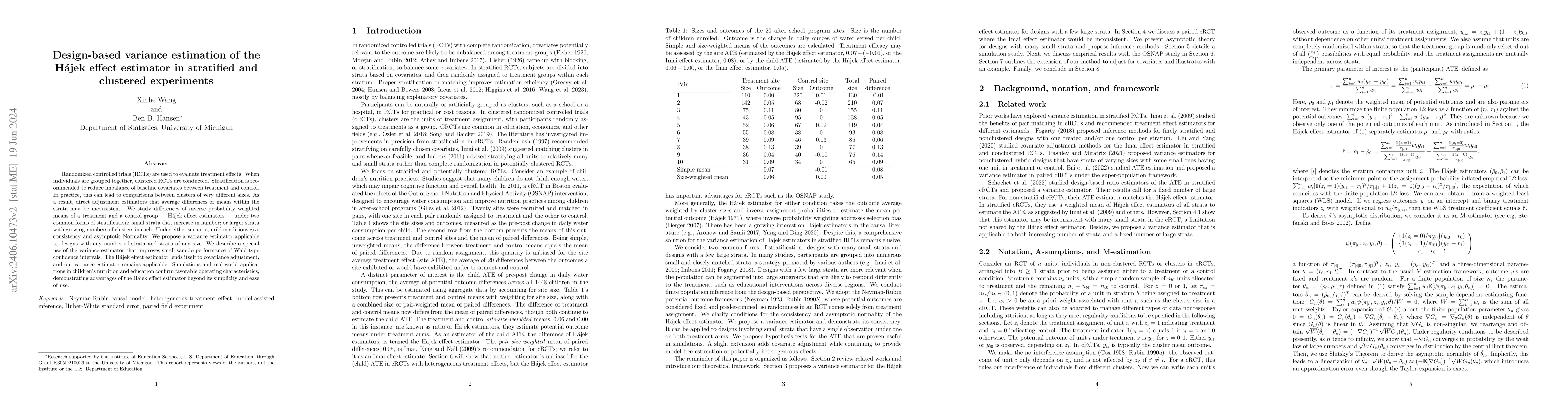 Randomized controlled trials (RCTs) are used to evaluate treatment effects. When individuals are grouped together, clustered RCTs are conducted. Stratification is recommended to reduce imbalance of baseline covariates between treatment and control. In practice, this can lead to comparisons between clusters of very different sizes. As a result, direct adjustment estimators that average differences of means within the strata may be inconsistent. We study differences of inverse probability weighted means of a treatment and a control group -- H\'ajek effect estimators -- under two common forms of stratification: small strata that increase in number; or larger strata with growing numbers of clusters in each. Under either scenario, mild conditions give consistency and asymptotic Normality. We propose a variance estimator applicable to designs with any number of strata and strata of any size. We describe a special use of the variance estimator that improves small sample performance of Wald-type confidence intervals. The H\'ajek effect estimator lends itself to covariance adjustment, and our variance estimator remains applicable. Simulations and real-world applications in children's nutrition and education confirm favorable operating characteristics, demonstrating advantages of the H\'ajek effect estimator beyond its simplicity and ease of use.
