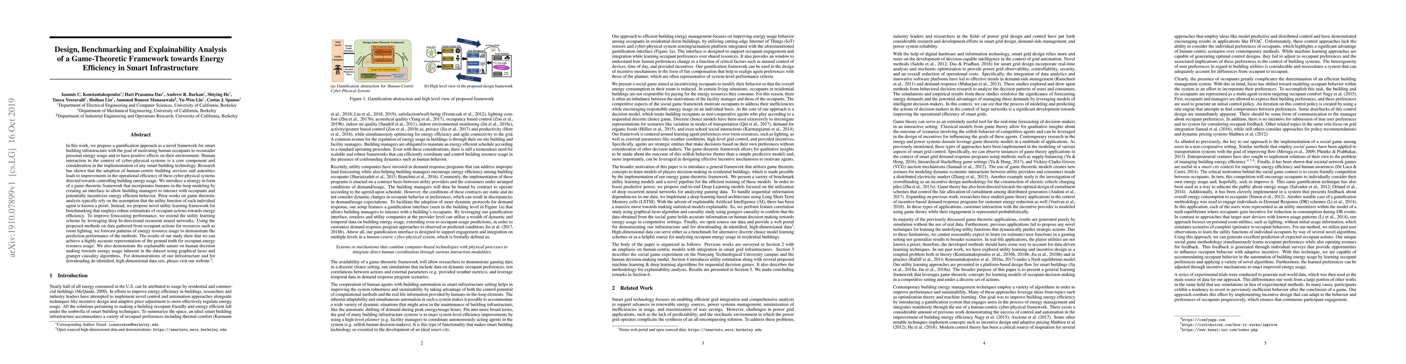 In this paper, we propose a gamification approach as a novel framework for smart building infrastructure with the goal of motivating human occupants to reconsider personal energy usage and to have positive effects on their environment. Human interaction in the context of cyber-physical systems is a core component and consideration in the implementation of any smart building technology. Research has shown that the adoption of human-centric building services and amenities leads to improvements in the operational efficiency of these cyber-physical systems directed towards controlling building energy usage. We introduce a strategy in form of a game-theoretic framework that incorporates humans-in-the-loop modeling by creating an interface to allow building managers to interact with occupants and potentially incentivize energy efficient behavior. Prior works on game theoretic analysis typically rely on the assumption that the utility function of each individual agent is known a priori. Instead, we propose novel utility learning framework for benchmarking that employs robust estimations of occupant actions towards energy efficiency. To improve forecasting performance, we extend the utility learning scheme by leveraging deep bi-directional recurrent neural networks. Using the proposed methods on data gathered from occupant actions for resources such as room lighting, we forecast patterns of energy resource usage to demonstrate the prediction performance of the methods. The results of our study show that we can achieve a highly accurate representation of the ground truth for occupant energy resource usage. We also demonstrate the explainable nature on human decision making towards energy usage inherent in the dataset using graphical lasso and granger causality algorithms. Finally, we open source the de-identified, high-dimensional data pertaining to the energy game-theoretic framework.