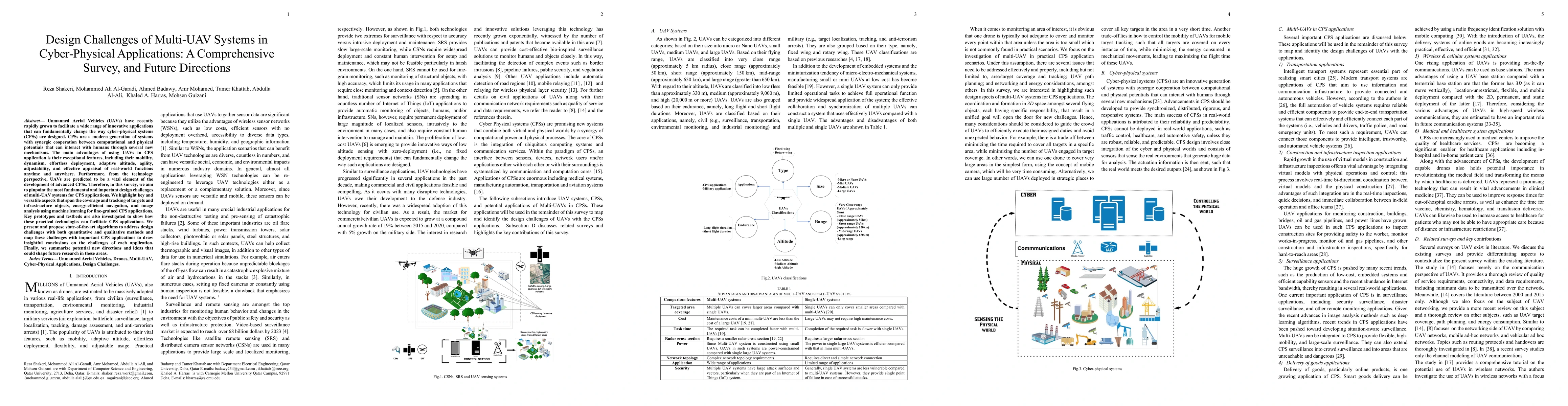 This paper surveys the design challenges of multi-UAV systems in cyber-physical applications, focusing on aspects like target coverage, energy-efficient navigation, and machine learning-based image analysis. It proposes state-of-the-art algorithms and discusses future research directions to enhance UAV integration in advanced cyber-physical systems.