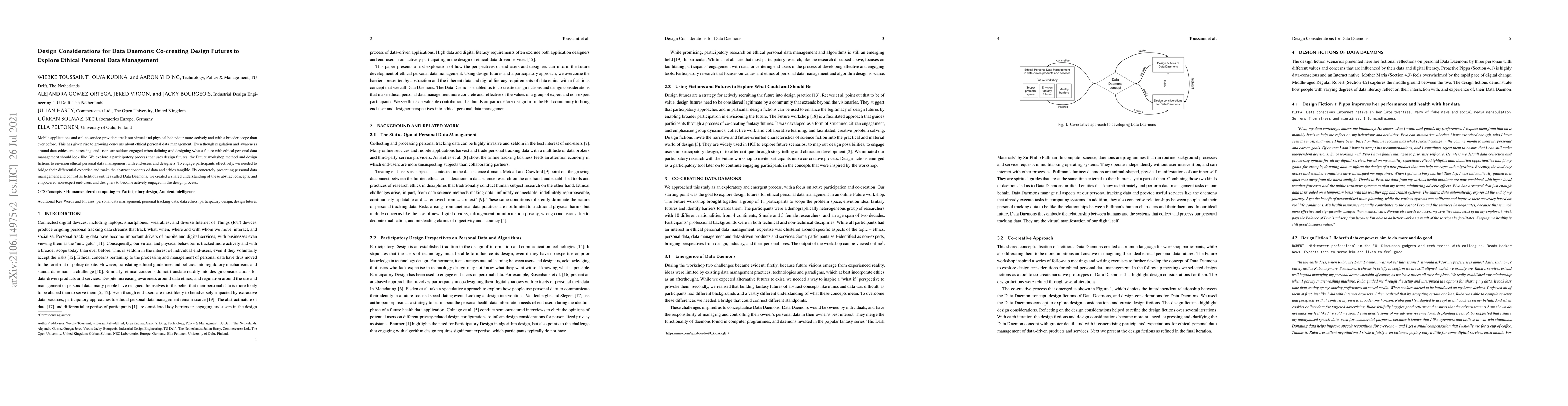This work is novel in its approach to engage diverse stakeholders in co-creating design considerations for ethical personal data management using participatory design, design fictions, and the Future workshop method.