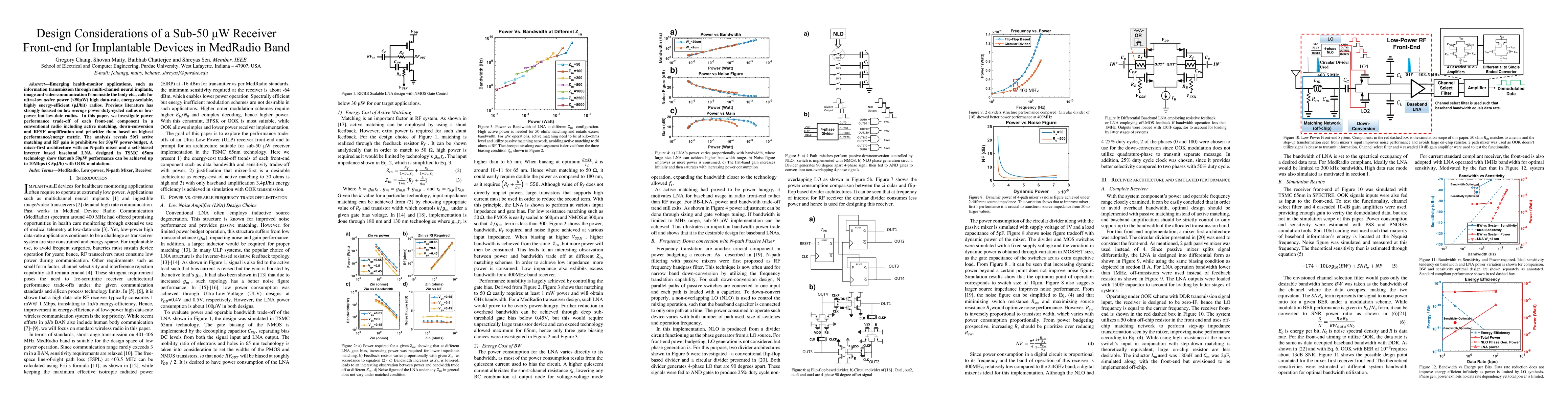 Emerging health-monitor applications, such as information transmission through multi-channel neural implants, image and video communication from inside the body etc., calls for ultra-low active power (<50${\mu}$W) high data-rate, energy-scalable, highly energy-efficient (pJ/bit) radios. Previous literature has strongly focused on low average power duty-cycled radios or low power but low-date radios. In this paper, we investigate power performance trade-off of each front-end component in a conventional radio including active matching, down-conversion and RF/IF amplification and prioritize them based on highest performance/energy metric. The analysis reveals 50${\Omega}$ active matching and RF gain is prohibitive for 50${\mu}$W power-budget. A mixer-first architecture with an N-path mixer and a self-biased inverter based baseband LNA, designed in TSMC 65nm technology show that sub 50${\mu}$W performance can be achieved up to 10Mbps (< 5pJ/b) with OOK modulation.