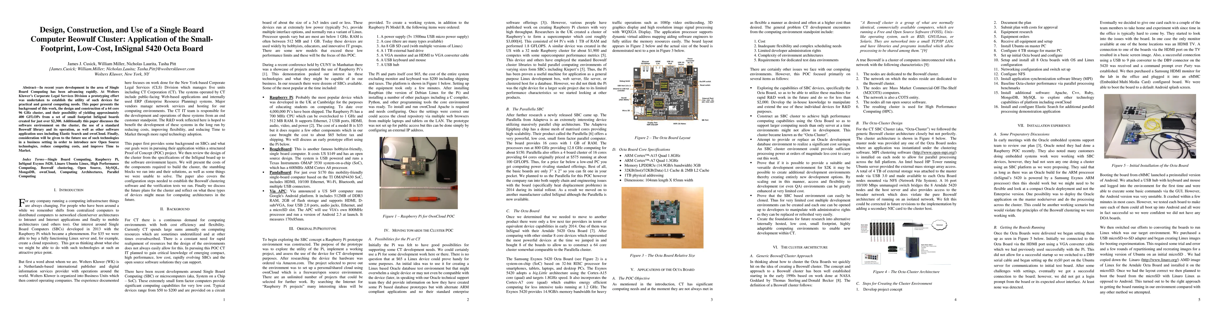 In recent years development in the area of Single Board Computing has been advancing rapidly. At Wolters Kluwer's Corporate Legal Services Division a prototyping effort was undertaken to establish the utility of such devices for practical and general computing needs. This paper presents the background of this work, the design and construction of a 64 core 96 GHz cluster, and their possibility of yielding approximately 400 GFLOPs from a set of small footprint InSignal boards created for just over $2,300. Additionally this paper discusses the software environment on the cluster, the use of a standard Beowulf library and its operation, as well as other software application uses including Elastic Search and ownCloud. Finally, consideration will be given to the future use of such technologies in a business setting in order to introduce new Open Source technologies, reduce computing costs, and improve Time to Market. Index Terms: Single Board Computing, Raspberry Pi, InSignal Exynos 5420, Linaro Ubuntu Linux, High Performance Computing, Beowulf clustering, Open Source, MySQL, MongoDB, ownCloud, Computing Architectures, Parallel Computing, Cluster Computing