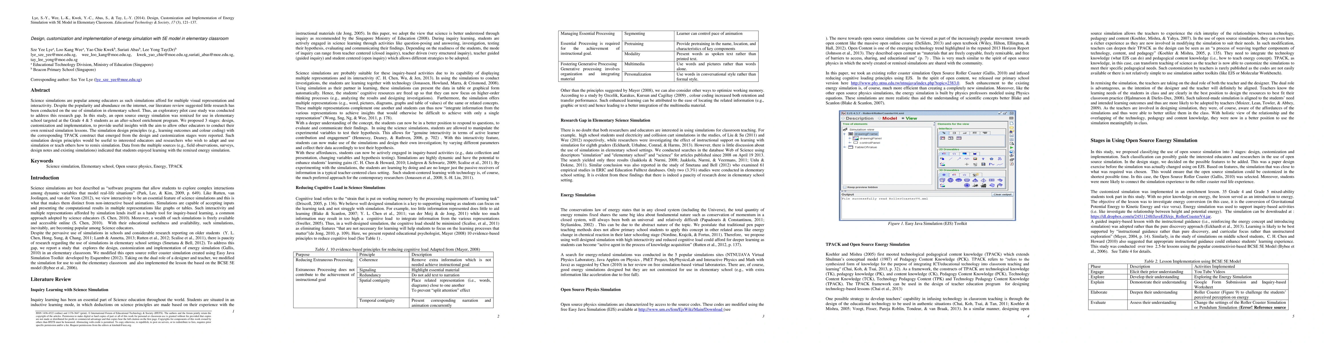 This exploratory study designed, customized, and implemented an open-source energy simulation for Grade 4 & 5 students, revealing that students enjoyed learning with the remixed simulation. The research offers principles and TPACK construct for educators to adapt simulations for teaching.