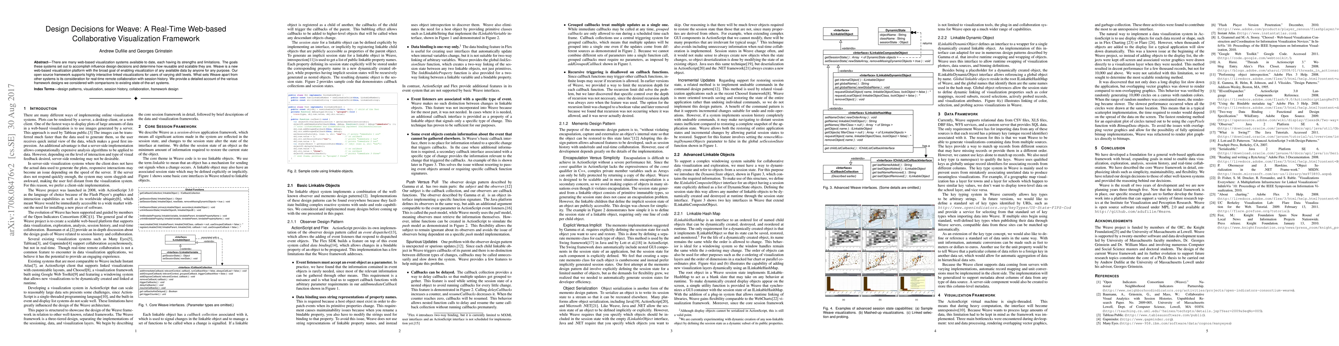 Weave is an open-source web-based collaborative visualization framework designed for real-time, interactive data visualization with remote collaboration and session history. The paper details design decisions and compares Weave's approach to existing systems, highlighting its scalability and reusability.