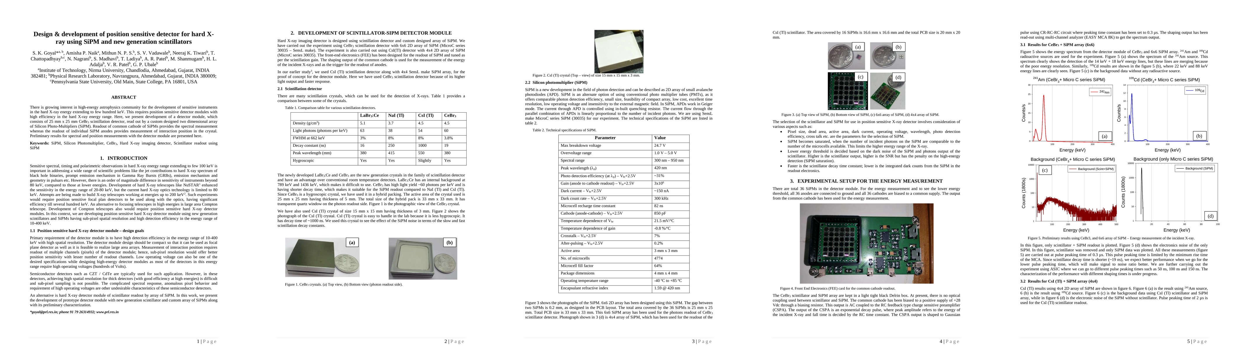 There is growing interest in high-energy astrophysics community for the development of sensitive instruments in the hard X-ray energy extending to few hundred keV. This requires position sensitive detector modules with high efficiency in the hard X-ray energy range. Here, we present development of a detector module, which consists of 25 mm x 25 mm CeBr3 scintillation detector, read out by a custom designed two dimensional array of Silicon Photo-Multipliers (SiPM). Readout of common cathode of SiPMs provides the spectral measurement whereas the readout of individual SiPM anodes provides measurement of interaction position in the crystal. Preliminary results for spectral and position measurements with the detector module are presented here.