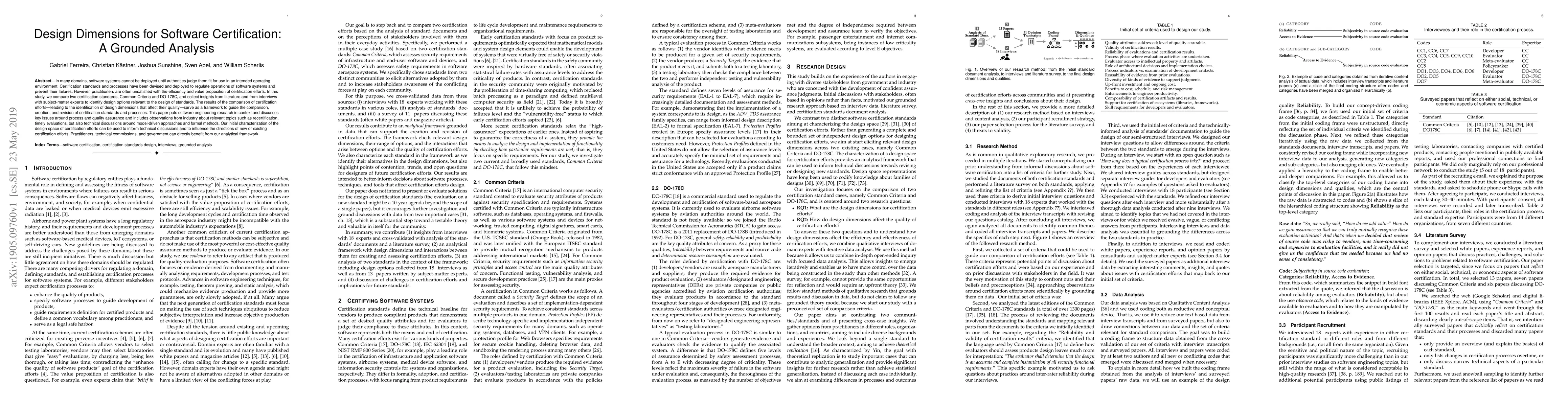 A study analyzed two software certification standards to identify design dimensions affecting their quality, providing a framework for guiding process and quality assurance in software engineering.