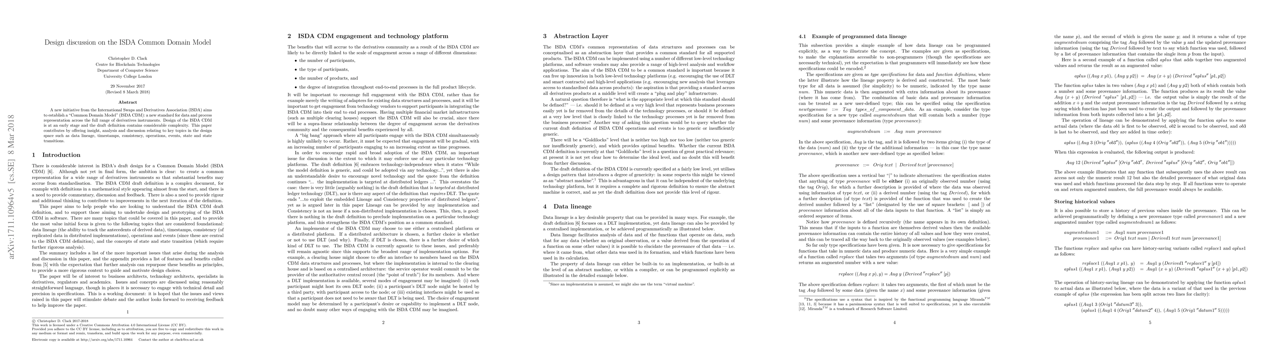 A new initiative from the International Swaps and Derivatives Association (ISDA) aims to establish a "Common Domain Model" (ISDA CDM): a new standard for data and process representation across the full range of derivatives instruments. Design of the ISDA CDM is at an early stage and the draft definition contains considerable complexity. This paper contributes by offering insight, analysis and discussion relating to key topics in the design space such as data lineage, timestamps, consistency, operations, events, state and state transitions.