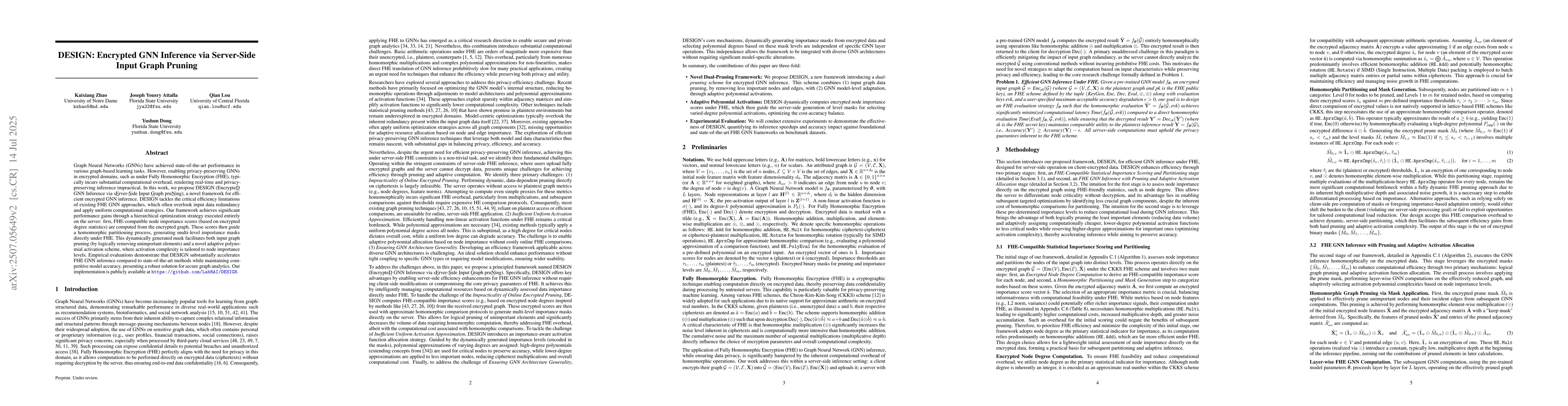 The research introduces DESIGN, a framework for efficient encrypted GNN inference, addressing computational overhead in FHE-based privacy-preserving GNNs. It uses FHE-compatible node importance scores and homomorphic partitioning to generate importance masks for graph pruning and adaptive activation, significantly accelerating inference with maintained accuracy.