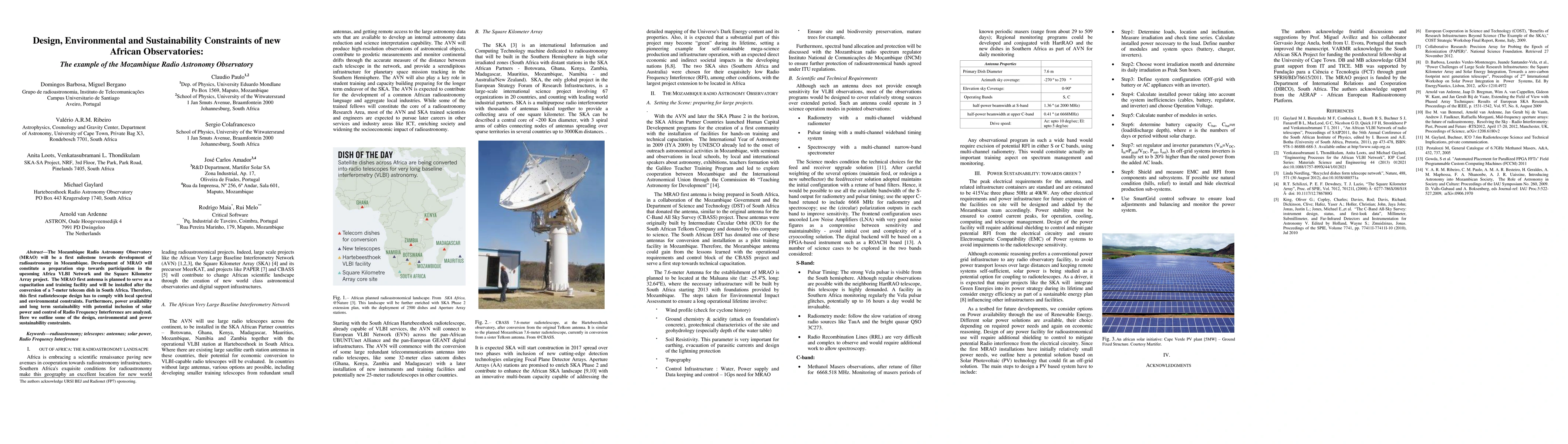 The Mozambique Radio Astronomy Observatory (MRAO) will be a first milestone towards development of radioastronomy in Mozambique. Development of MRAO will constitute a preparation step towards participation in the upcoming Africa VLBI Network and the Square Kilometer Array project. The MRAO first antenna is planned to serve as a capacitation and training facility and will be installed after the conversion of a 7-meter telecom dish in South Africa. Therefore, this first radiotelescope design has to comply with local spectral and environmental constraints. Furthermore, power availability and long term sustainability with potential inclusion of solar power and control of Radio Frequency Interference are analyzed. Here we outline some of the design, environmental and power sustainability constraints.