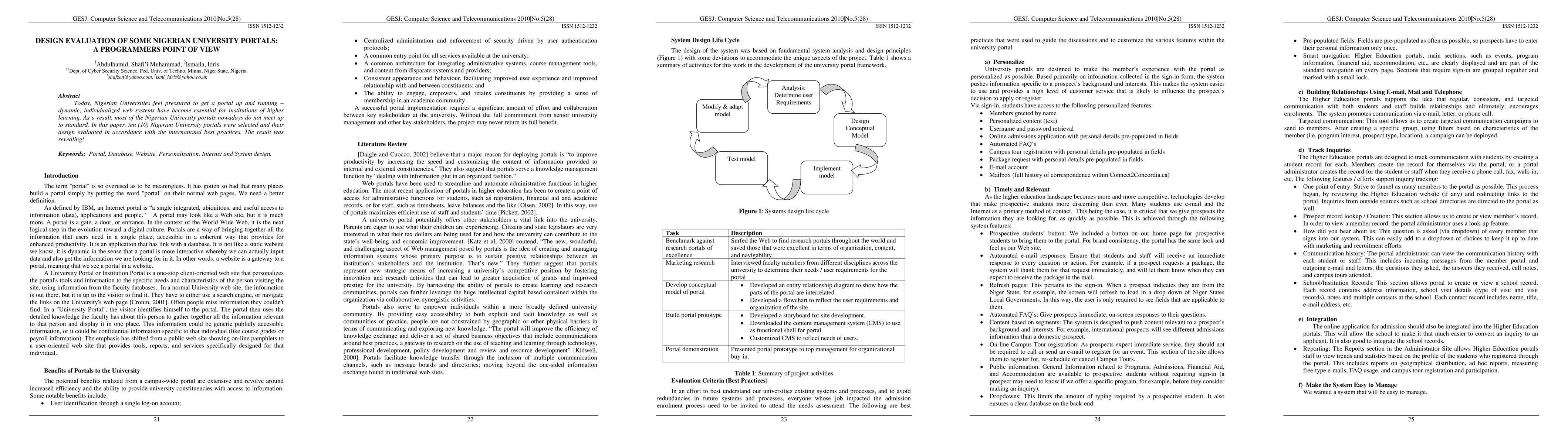 This paper evaluates the design of ten Nigerian university portals from a programmer's perspective, finding that most do not meet international best practices for dynamic, individualized web systems essential for higher education institutions. The evaluation reveals significant areas for improvement in the design standards of these portals.