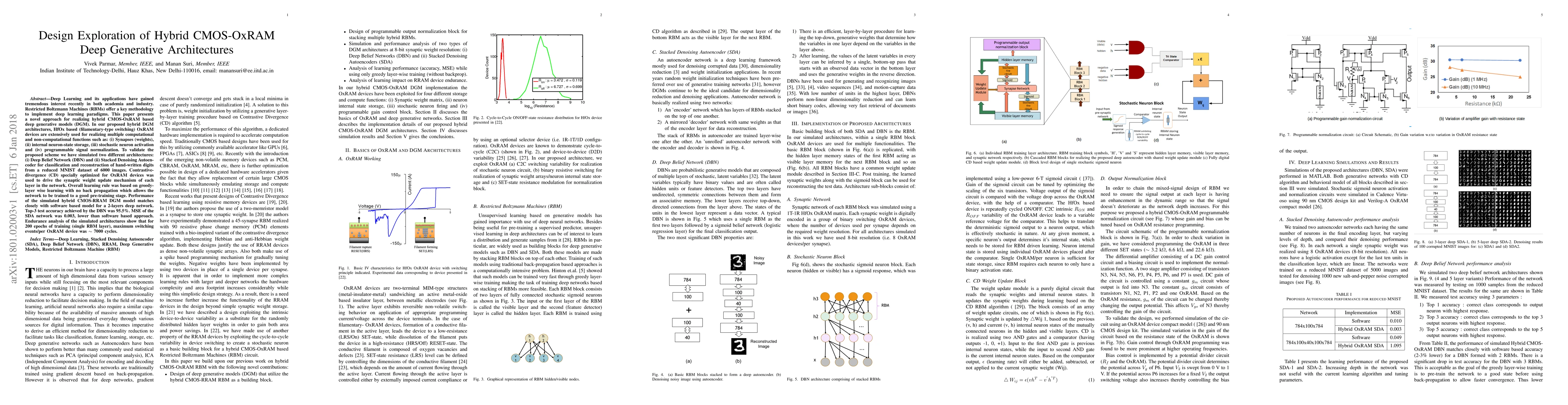 This research introduces hybrid CMOS-OxRAM deep generative models for deep learning applications, using HfOx-based OxRAM devices for synapses, neuron-state storage, stochastic activation, and normalization. Simulation of Deep Belief Network and Stacked Denoising Autoencoder on reduced MNIST dataset shows high accuracy (95.5%) and low mean squared error (0.003), comparable to software models. Endurance analysis indicates ~7000 switching cycles per OxRAM device for 200 training epochs.