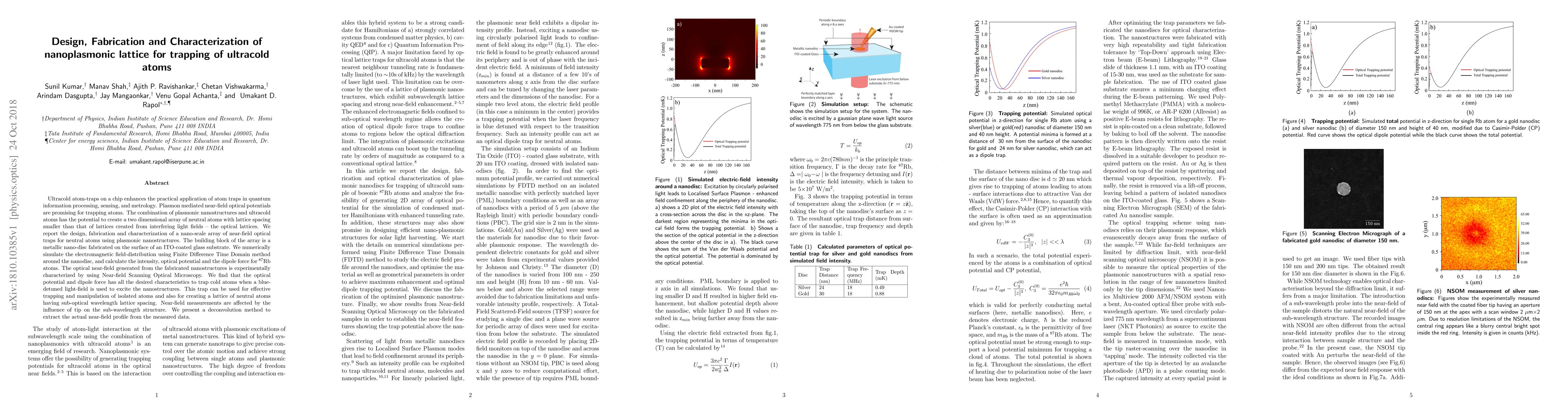 Ultracold atom-traps on a chip enhances the practical application of atom traps in quantum information processing, sensing, and metrology. Plasmon mediated near-field optical potentials are promising for trapping atoms. The combination of plasmonic nanostructures and ultracold atoms has the potential to create a two dimensional array of neutral atoms with lattice spacing smaller than that of lattices created from interfering light fields -- the optical lattices. We report the design, fabrication and characterization of a nano-scale array of near-field optical traps for neutral atoms using plasmonic nanostructures. The building block of the array is a metallic nano-disc fabricated on the surface of an ITO-coated glass substrate. We numerically simulate the electromagnetic field-distribution using Finite Difference Time Domain method around the nanodisc, and calculate the intensity, optical potential and the dipole force for $^{87}$Rb atoms. The optical near-field generated from the fabricated nanostructures is experimentally characterized by using Near-field Scanning Optical Microscopy. We find that the optical potential and dipole force has all the desired characteristics to trap cold atoms when a blue-detuned light-field is used to excite the nanostructures. This trap can be used for effective trapping and manipulation of isolated atoms and also for creating a lattice of neutral atoms having sub-optical wavelength lattice spacing. Near-field measurements are affected by the influence of tip on the sub-wavelength structure. We present a deconvolution method to extract the actual near-field profile from the measured data.