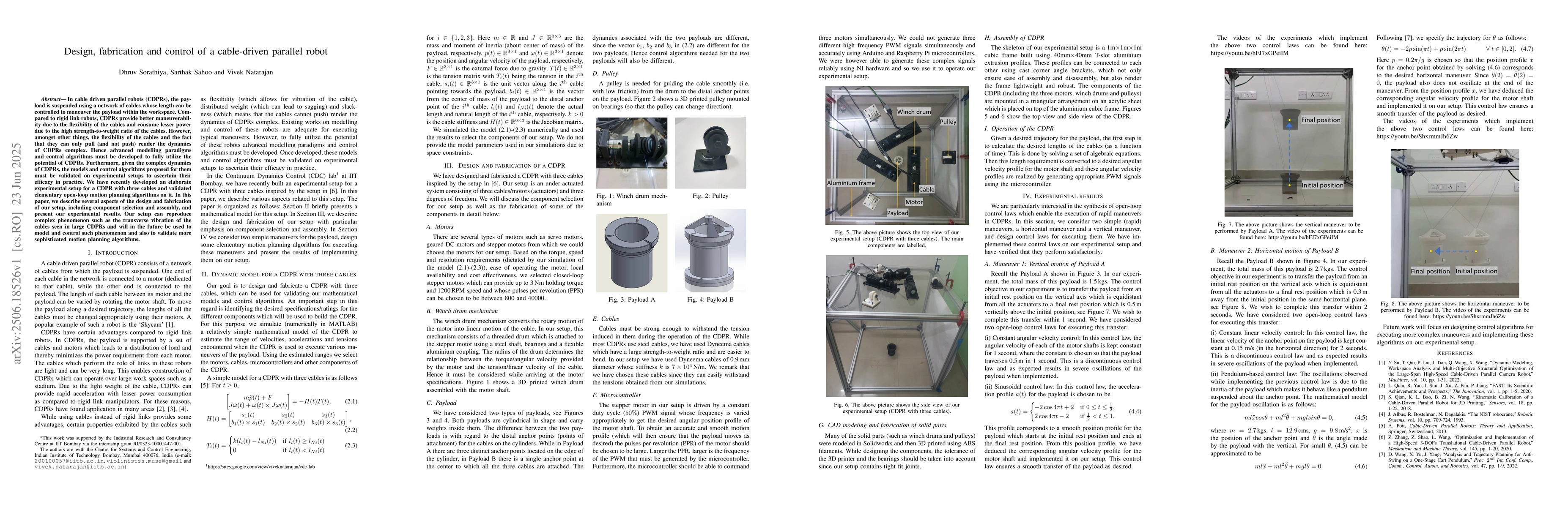 In cable driven parallel robots (CDPRs), the payload is suspended using a network of cables whose length can be controlled to maneuver the payload within the workspace. Compared to rigid link robots, CDPRs provide better maneuverability due to the flexibility of the cables and consume lesser power due to the high strength-to-weight ratio of the cables. However, amongst other things, the flexibility of the cables and the fact that they can only pull (and not push) render the dynamics of CDPRs complex. Hence advanced modelling paradigms and control algorithms must be developed to fully utilize the potential of CDPRs. Furthermore, given the complex dynamics of CDPRs, the models and control algorithms proposed for them must be validated on experimental setups to ascertain their efficacy in practice. We have recently developed an elaborate experimental setup for a CDPR with three cables and validated elementary open-loop motion planning algorithms on it. In this paper, we describe several aspects of the design and fabrication of our setup, including component selection and assembly, and present our experimental results. Our setup can reproduce complex phenomenon such as the transverse vibration of the cables seen in large CDPRs and will in the future be used to model and control such phenomenon and also to validate more sophisticated motion planning algorithms.