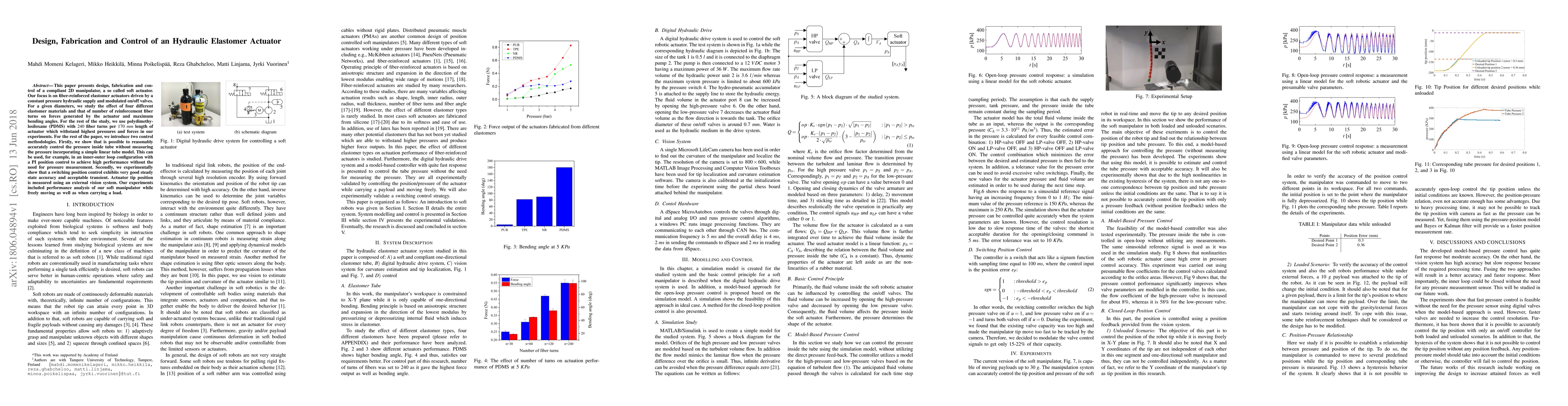 This paper presents design, fabrication and control of a compliant 2D manipulator, a so called soft actuator. Our focus is on fiber-reinforced elastomer actuators driven by a constant pressure hydraulic supply and modulated on/off valves. For a given diameters, we study the effect of four different elastomer materials and that of number of reinforcement fiber turns on forces generated by the actuator and maximum bending angles. For the rest of the study, we use polydimethylosiloxane (PDMS) with 240 fiber turns per 170mm length of actuator which withstand highest pressures and forces in our experiments. For the rest of the paper, we introduce two control methodologies. Firstly, we show that is possible to reasonably accurately control the pressure inside tube without measuring the pressure incorporating a simple linear tube model. This can be used, for example, in an inner-outer loop configuration with a PI position control to achieve high performance without the need for pressure measurement. Secondly, we experimentally show that a switching position control exhibits very good steady state accuracy and acceptable transient. Actuator tip position is measured using an external vision system. Our experiments included performance analysis of our soft manipulator while freely moving as well as when carrying a load.