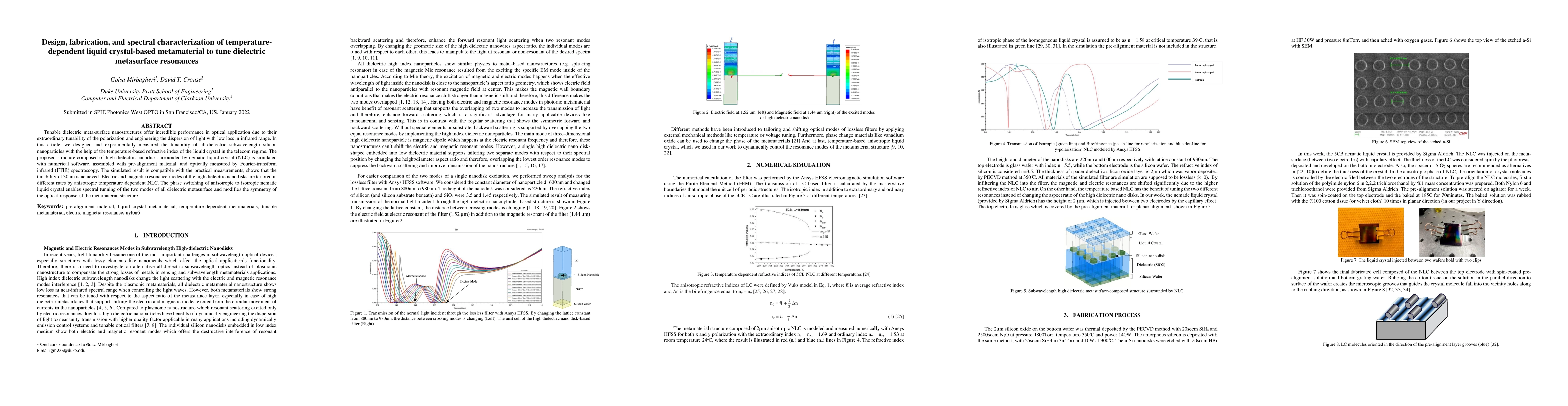 This paper details the design and fabrication of a tunable liquid crystal-based metamaterial that utilizes temperature-dependent refractive index changes to adjust dielectric metasurface resonances in the infrared range. The study demonstrates a tunable range of 30nm through the anisotropic properties of nematic liquid crystal surrounding silicon nanodisks.
