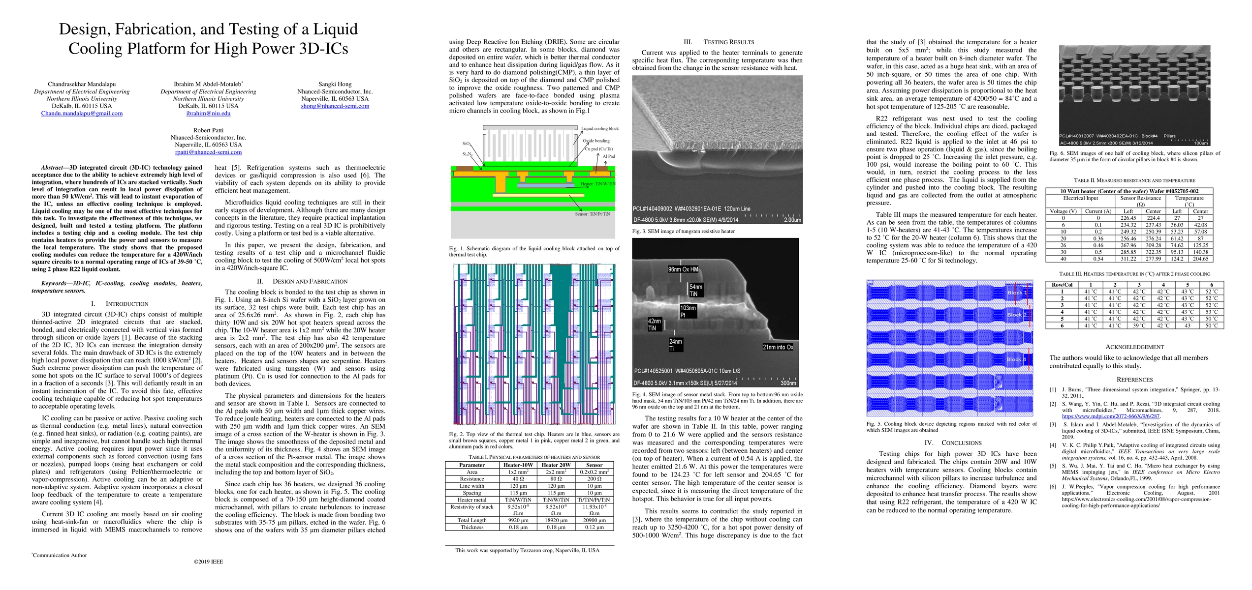 3D integrated circuit (3D-IC) technology gained acceptance due to the ability to achieve extremely high level of integration, where hundreds of ICs are stacked vertically. Such level of integration can result in local power dissipation of more than 50 kW/cm2. This will lead to instant evaporation of the IC, unless an effective cooling technique is employed. Liquid cooling may be one of the most effective techniques for this task. To investigate the effectiveness of this technique, we designed, built and tested a testing platform. The platform includes a testing chip and a cooling module. The test chip contains heaters to provide the power and sensors to measure the local temperature. The study shows that the proposed cooling modules can reduce the temperature for a 420W/inch square circuits to a normal operating range of ICs of 39-50 degrees centigrade, using 2 phase R22 liquid coolant.