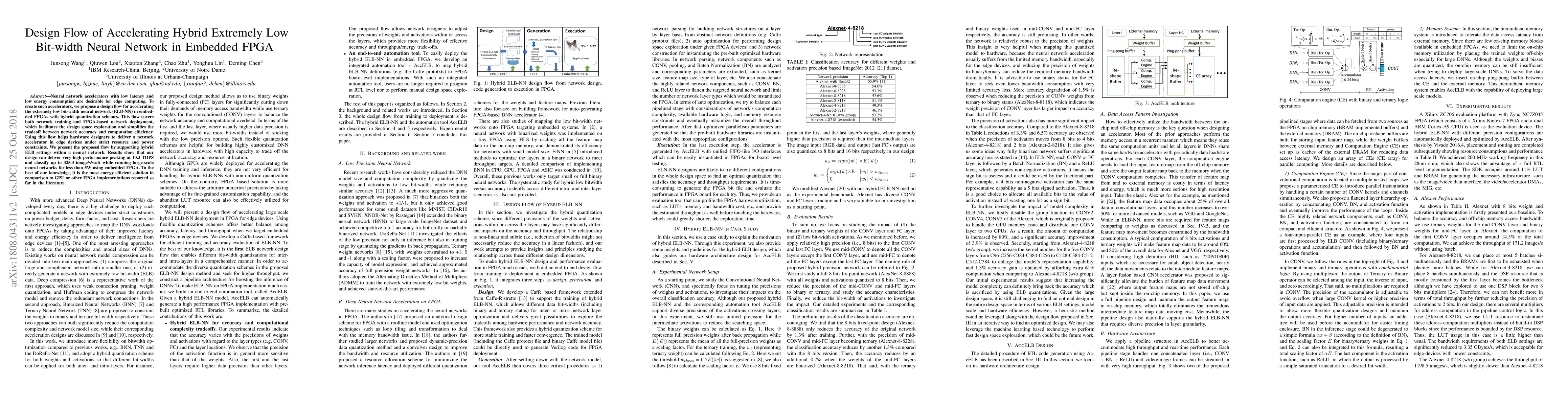 This paper proposes a design flow for accelerating extremely low bit-width neural networks in embedded FPGAs using hybrid quantization schemes, achieving high performance and low energy consumption for edge computing. The design facilitates trade-offs between accuracy and efficiency, delivering up to 10.3 TOPS and 325.3 image/s/watt while consuming less than 5W.