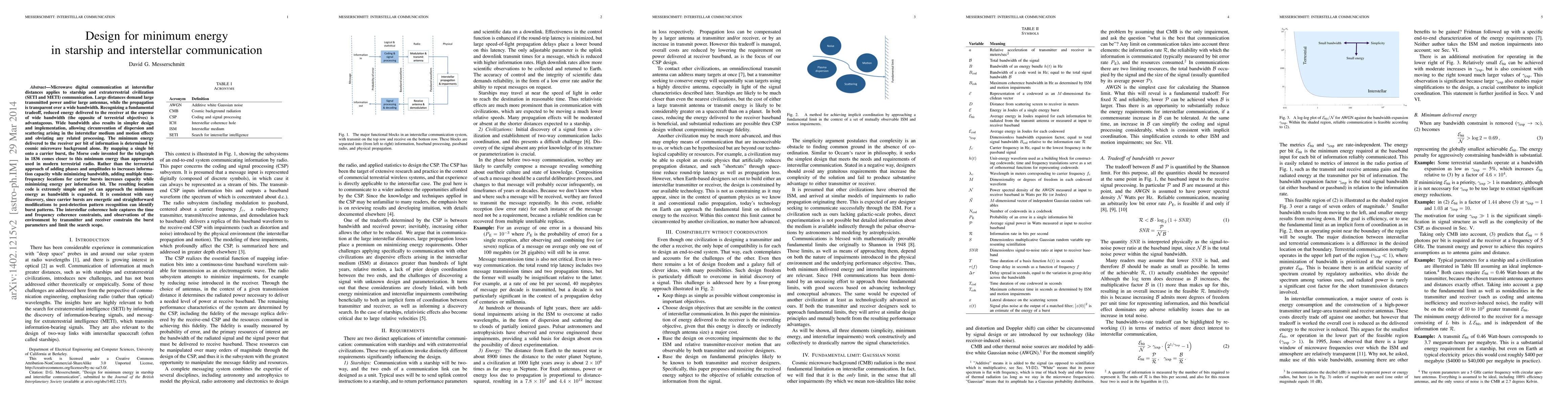 Microwave digital communication at interstellar distances applies to starship and extraterrestrial civilization (SETI and METI) communication. Large distances demand large transmitted power and/or large antennas, while the propagation is transparent over a wide bandwidth. Recognizing a fundamental tradeoff, reduced energy delivered to the receiver at the expense of wide bandwidth (the opposite of terrestrial objectives) is advantageous. Wide bandwidth also results in simpler design and implementation, allowing circumvention of dispersion and scattering arising in the interstellar medium and motion effects and obviating any related processing. The minimum energy delivered to the receiver per bit of information is determined by cosmic microwave background alone. By mapping a single bit onto a carrier burst, the Morse code invented for the telegraph in 1836 comes closer to this minimum energy than approaches used in modern terrestrial radio. Rather than the terrestrial approach of adding phases and amplitudes to increases information capacity while minimizing bandwidth, adding multiple time-frequency locations for carrier bursts increases capacity while minimizing energy per information bit. The resulting location code is extremely simple and yet can approach the minimum energy as bandwidth is expanded. It is consistent with easy discovery, since carrier bursts are energetic and straightforward modifications to post-detection pattern recognition can identify burst patterns. The interstellar coherence hole captures the time and frequency coherence constraints, and observations of the environment by transmitter and receiver constrain the burst parameters and limit the search scope.