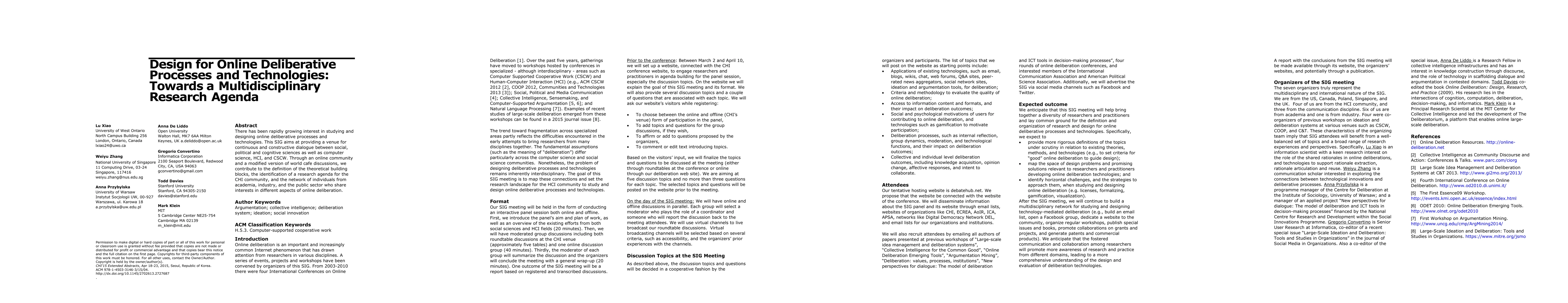 There has been rapidly growing interest in studying and designing online deliberative processes and technologies. This SIG aims at providing a venue for continuous and constructive dialogue between social, political and cognitive sciences as well as computer science, HCI, and CSCW. Through an online community and a modified version of world cafe discussions, we contribute to the definition of the theoretical building blocks, the identification of a research agenda for the CHI community, and the network of individuals from academia, industry, and the public sector who share interests in different aspects of online deliberation.