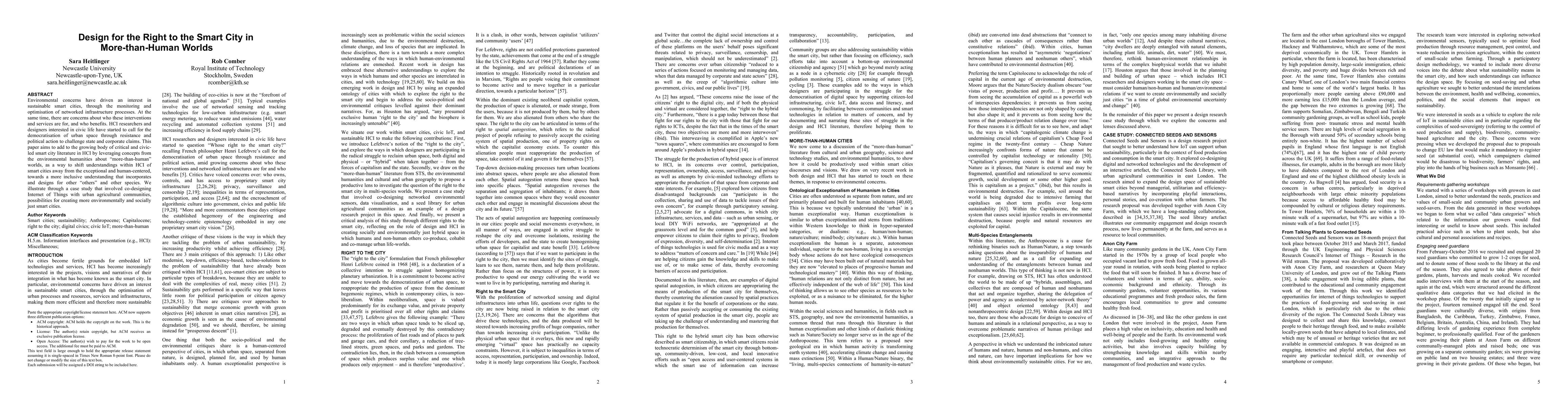 Environmental concerns have driven an interest in sustainable smart cities, through the monitoring and optimisation of networked infrastructure processes. At the same time, there are concerns about who these interventions and services are for, and who benefits. HCI researchers and designers interested in civic life have started to call for the democratisation of urban space through resistance and political action to challenge state and corporate claims. This paper aims to add to the growing body of critical and civic led smart city literature in HCI by leveraging concepts from the environmental humanities about more than human worlds, as a way to shift understandings within HCI of smart cities away from the exceptional and human centered, towards a more inclusive understanding that incorporates and designs for other others and other species. We illustrate through a case study that involved codesigning Internet of Things with urban agricultural communities, possibilities for creating more environmentally and socially just smart cities.