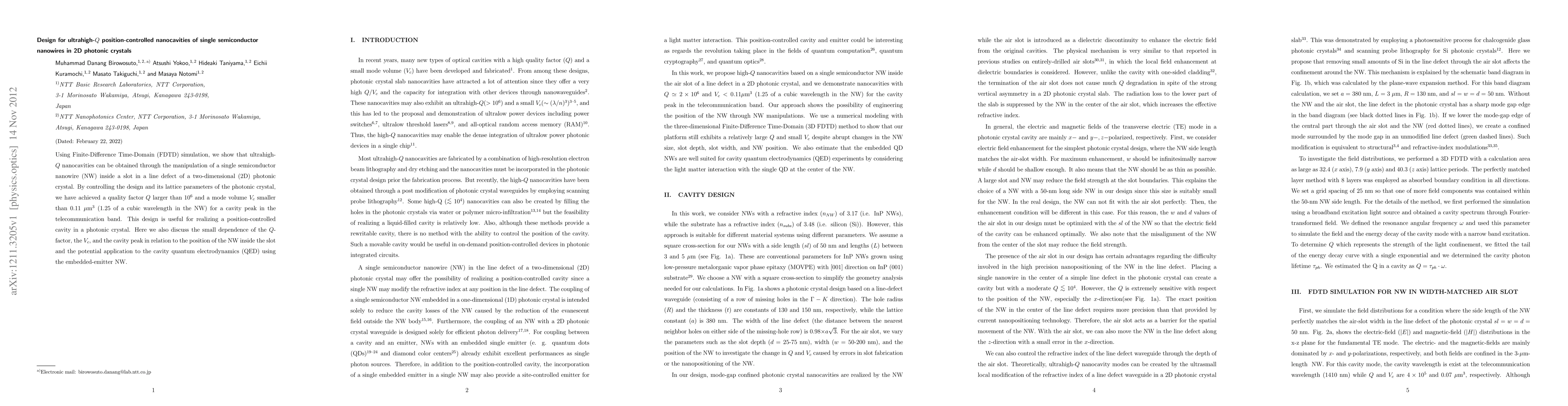 This paper demonstrates the design of ultrahigh-Q position-controlled nanocavities using a single semiconductor nanowire embedded in a 2D photonic crystal. Simulation results show a quality factor exceeding 106 and a compact mode volume, making it suitable for cavity quantum electrodynamics applications.