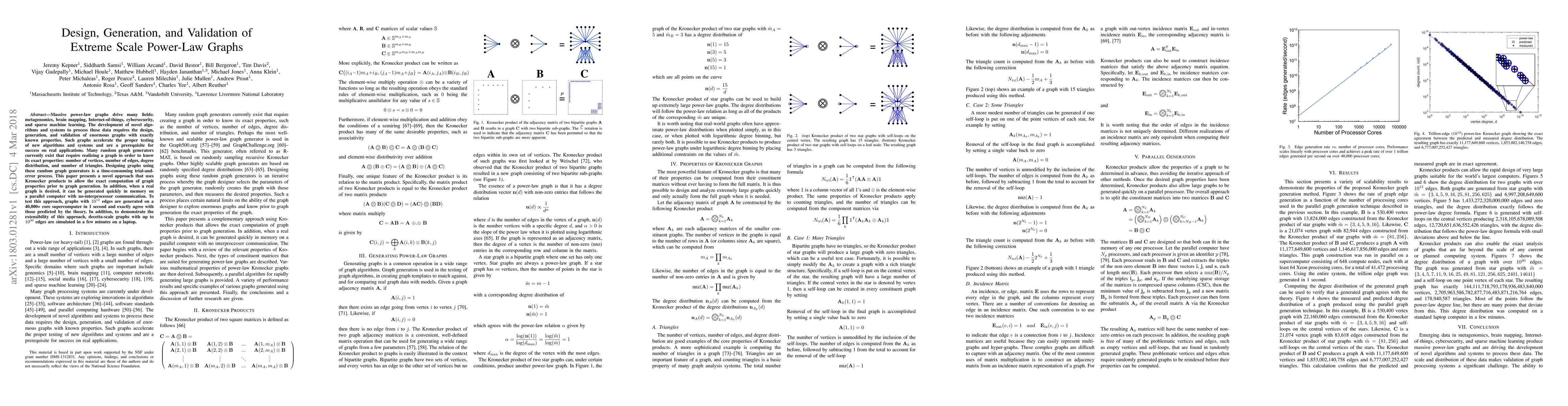 Massive power-law graphs drive many fields: metagenomics, brain mapping, Internet-of-things, cybersecurity, and sparse machine learning. The development of novel algorithms and systems to process these data requires the design, generation, and validation of enormous graphs with exactly known properties. Such graphs accelerate the proper testing of new algorithms and systems and are a prerequisite for success on real applications. Many random graph generators currently exist that require realizing a graph in order to know its exact properties: number of vertices, number of edges, degree distribution, and number of triangles. Designing graphs using these random graph generators is a time-consuming trial-and-error process. This paper presents a novel approach that uses Kronecker products to allow the exact computation of graph properties prior to graph generation. In addition, when a real graph is desired, it can be generated quickly in memory on a parallel computer with no-interprocessor communication. To test this approach, graphs with $10^{12}$ edges are generated on a 40,000+ core supercomputer in 1 second and exactly agree with those predicted by the theory. In addition, to demonstrate the extensibility of this approach, decetta-scale graphs with up to $10^{30}$ edges are simulated in a few minutes on a laptop.