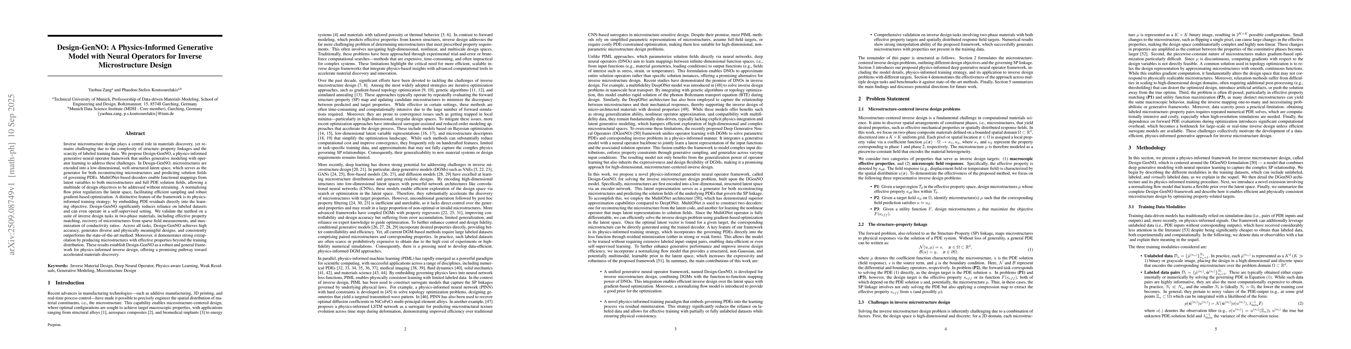 Inverse microstructure design plays a central role in materials discovery, yet remains challenging due to the complexity of structure-property linkages and the scarcity of labeled training data. We propose Design-GenNO, a physics-informed generative neural operator framework that unifies generative modeling with operator learning to address these challenges. In Design-GenNO, microstructures are encoded into a low-dimensional, well-structured latent space, which serves as the generator for both reconstructing microstructures and predicting solution fields of governing PDEs. MultiONet-based decoders enable functional mappings from latent variables to both microstructures and full PDE solution fields, allowing a multitude of design objectives to be addressed without retraining. A normalizing flow prior regularizes the latent space, facilitating efficient sampling and robust gradient-based optimization. A distinctive feature of the framework is its physics-informed training strategy: by embedding PDE residuals directly into the learning objective, Design-GenNO significantly reduces reliance on labeled datasets and can even operate in a self-supervised setting. We validate the method on a suite of inverse design tasks in two-phase materials, including effective property matching, recovery of microstructures from sparse field measurements, and maximization of conductivity ratios. Across all tasks, Design-GenNO achieves high accuracy, generates diverse and physically meaningful designs, and consistently outperforms the state-of-the-art method. Moreover, it demonstrates strong extrapolation by producing microstructures with effective properties beyond the training distribution. These results establish Design-GenNO as a robust and general framework for physics-informed inverse design, offering a promising pathway toward accelerated materials discovery.