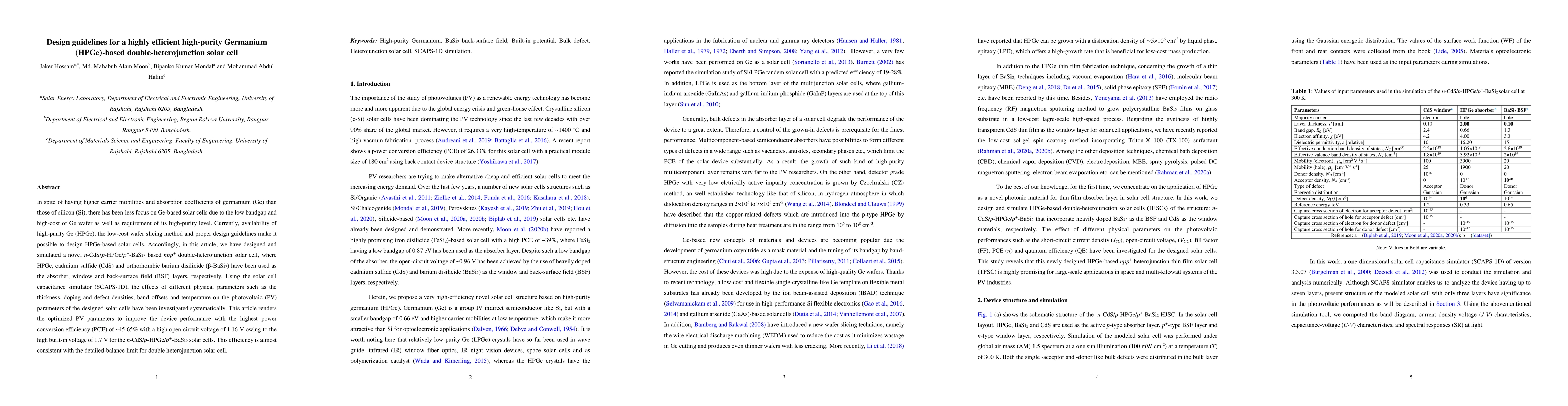 The paper presents a novel design for a high-efficiency double-heterojunction solar cell using high-purity germanium (HPGe), cadmium sulfide (CdS), and barium disilicide (BaSi2). Simulation results indicate a maximum power conversion efficiency of ~45.65% with a high open-circuit voltage of 1.16 V, approaching the detailed-balance limit for such solar cells.