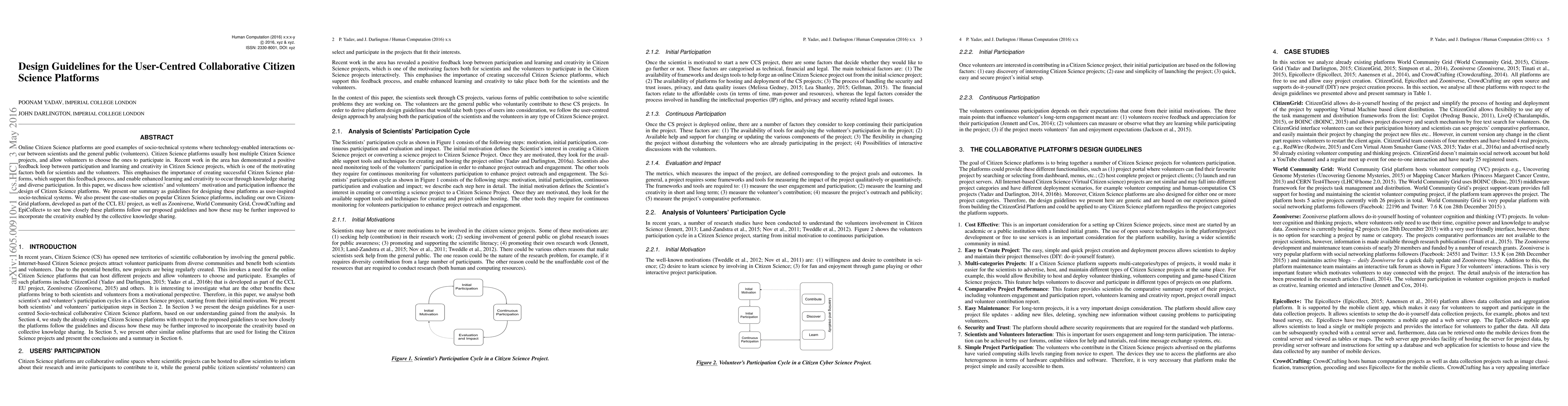 This paper outlines design guidelines for user-centred collaborative Citizen Science platforms, emphasizing the importance of fostering participation and creativity through knowledge sharing. It examines how scientists' and volunteers' motivations influence platform design and uses case studies of popular platforms to assess their adherence to these guidelines and suggest improvements.