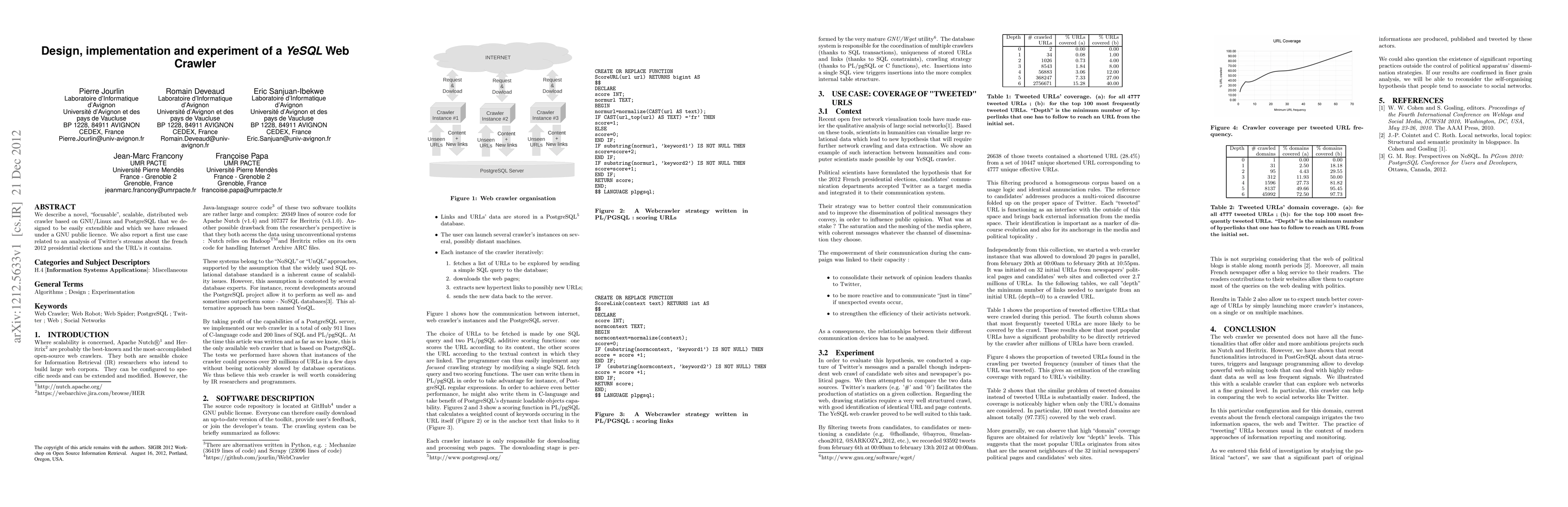 This paper presents a scalable, distributed web crawler built on GNU/Linux and PostgreSQL, designed for easy extension and released under a GNU public license. The crawler was tested by analyzing Twitter streams from the 2012 French presidential elections.