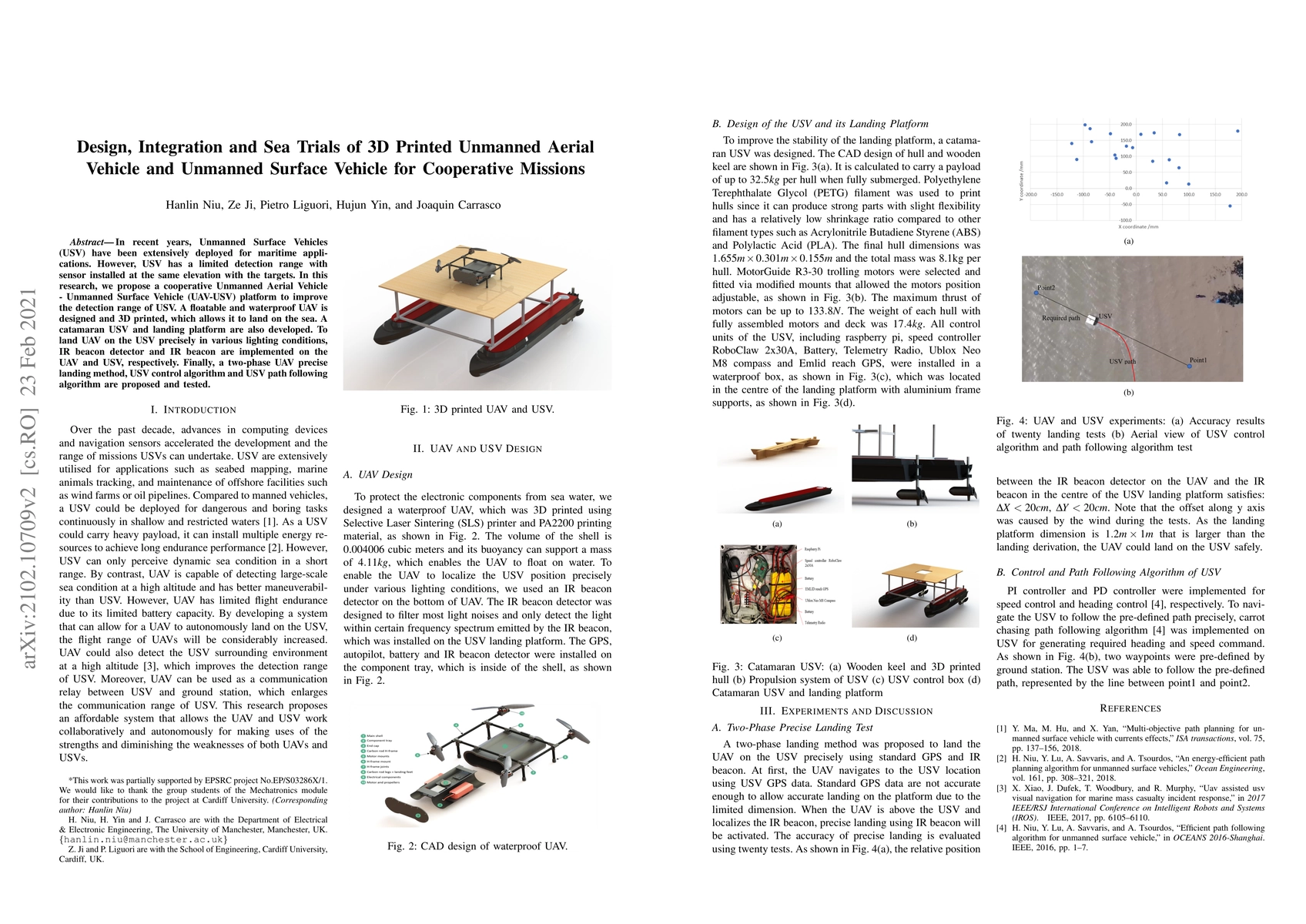 This research proposes a cooperative UAV-USV platform to enhance USV detection range. A 3D printed floatable UAV, capable of landing on the sea, is integrated with a catamaran USV, and a precise landing method is developed using IR beacons, along with control and path following algorithms tested through sea trials.