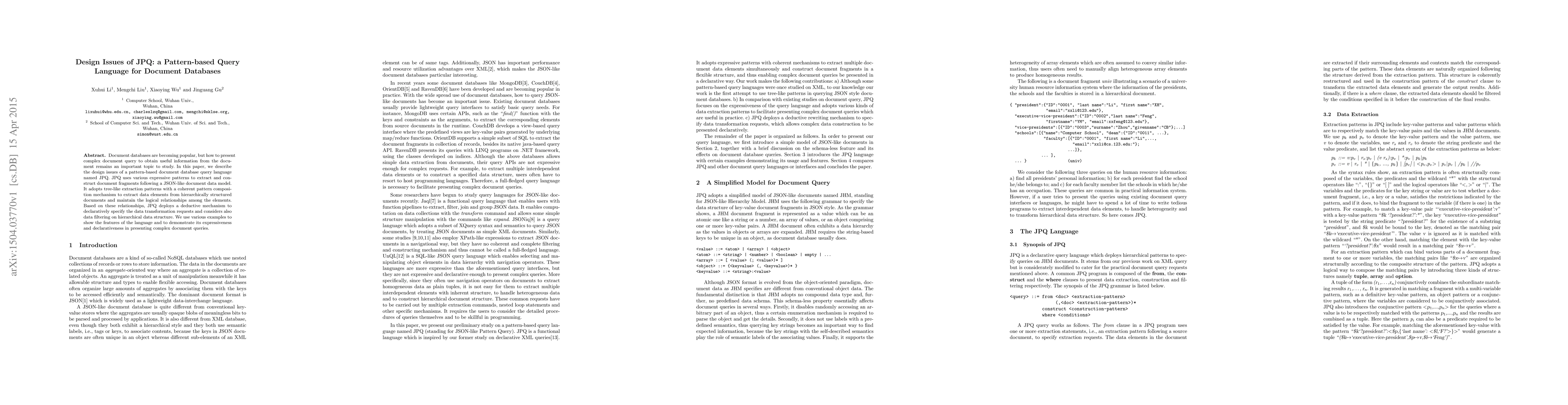 This paper presents the design issues of JPQ, a pattern-based query language for document databases, which uses expressive patterns to extract and transform hierarchically structured documents in a JSON-like format. It demonstrates JPQ's ability to declaratively specify complex queries while maintaining logical relationships and filtering data.