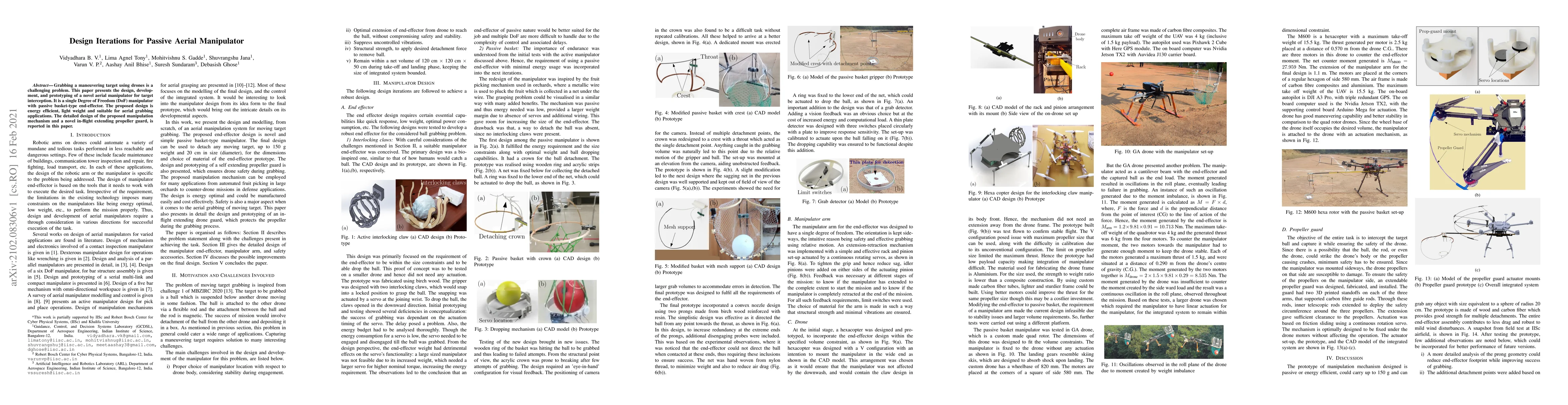Grabbing a manoeuvring target using drones is a challenging problem. This paper presents the design, development, and prototyping of a novel aerial manipulator for target interception. It is a single Degree of Freedom (DoF) manipulator with passive basket-type end-effector. The proposed design is energy efficient, light weight and suitable for aerial grabbing applications. The detailed design of the proposed manipulation mechanism and a novel in-flight extending propeller guard, is reported in this paper.