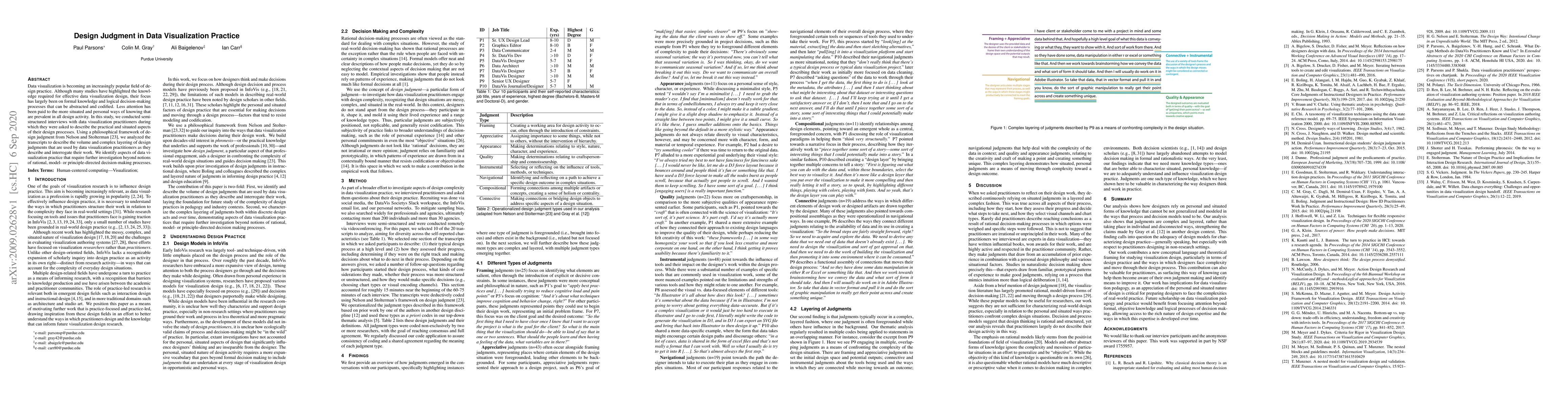 This study explores the situated and personal aspects of data visualization design through interviews with practitioners, revealing the complex layering of design judgments that go beyond formal knowledge and logical decision-making. The findings suggest a need for further investigation into the non-codified, practical elements of design judgment in this field.