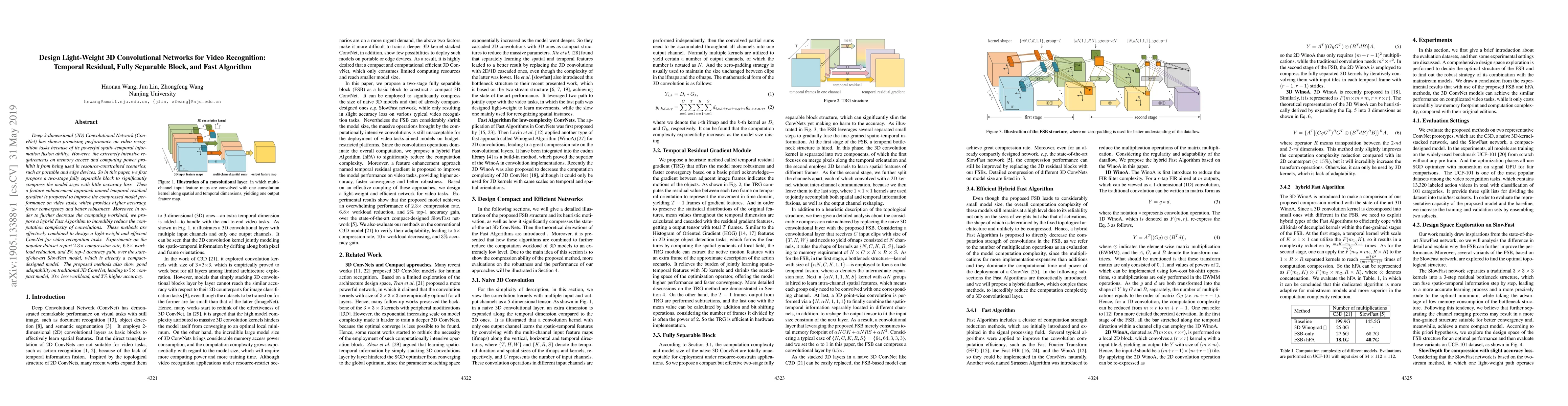 Deep 3-dimensional (3D) Convolutional Network (ConvNet) has shown promising performance on video recognition tasks because of its powerful spatio-temporal information fusion ability. However, the extremely intensive requirements on memory access and computing power prohibit it from being used in resource-constrained scenarios, such as portable and edge devices. So in this paper, we first propose a two-stage Fully Separable Block (FSB) to significantly compress the model sizes of 3D ConvNets. Then a feature enhancement approach named Temporal Residual Gradient (TRG) is developed to improve the performance of compressed model on video tasks, which provides higher accuracy, faster convergency and better robustness. Moreover, in order to further decrease the computing workload, we propose a hybrid Fast Algorithm (hFA) to drastically reduce the computation complexity of convolutions. These methods are effectively combined to design a light-weight and efficient ConvNet for video recognition tasks. Experiments on the popular dataset report 2.3x compression rate, 3.6x workload reduction, and 6.3% top-1 accuracy gain, over the state-of-the-art SlowFast model, which is already a highly compact model. The proposed methods also show good adaptability on traditional 3D ConvNet, demonstrating 7.4x more compact model, 11.0x less workload, and 3.0% higher accuracy