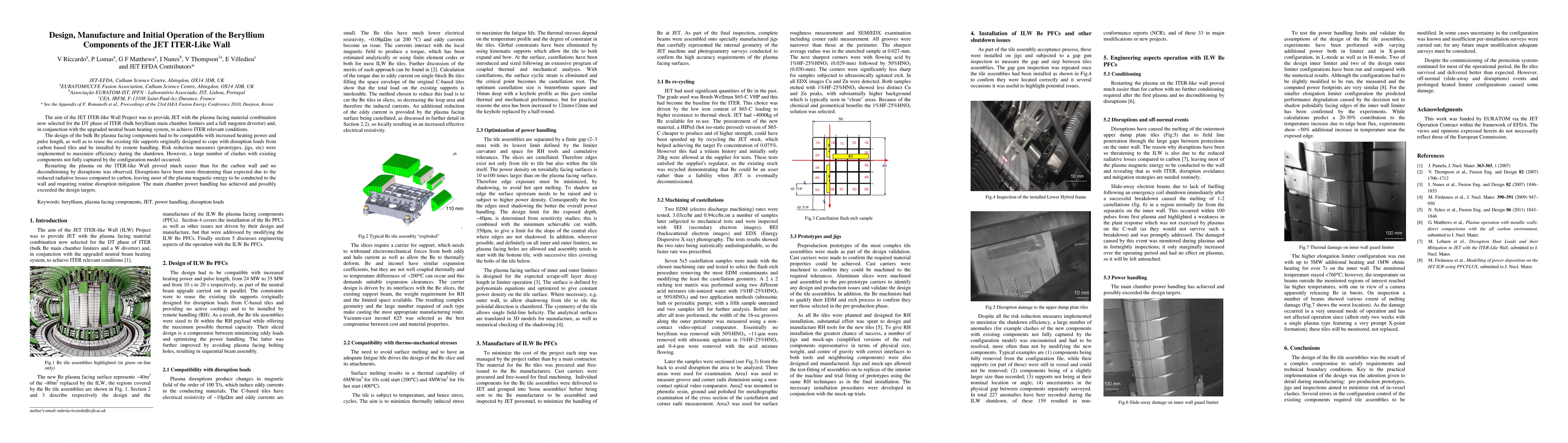 The JET ITER-like Wall Project successfully designed and manufactured beryllium components for plasma-facing materials, achieving ITER-relevant conditions. Despite clashes with existing components, disruptions have been manageable, and power handling has met or exceeded design targets.