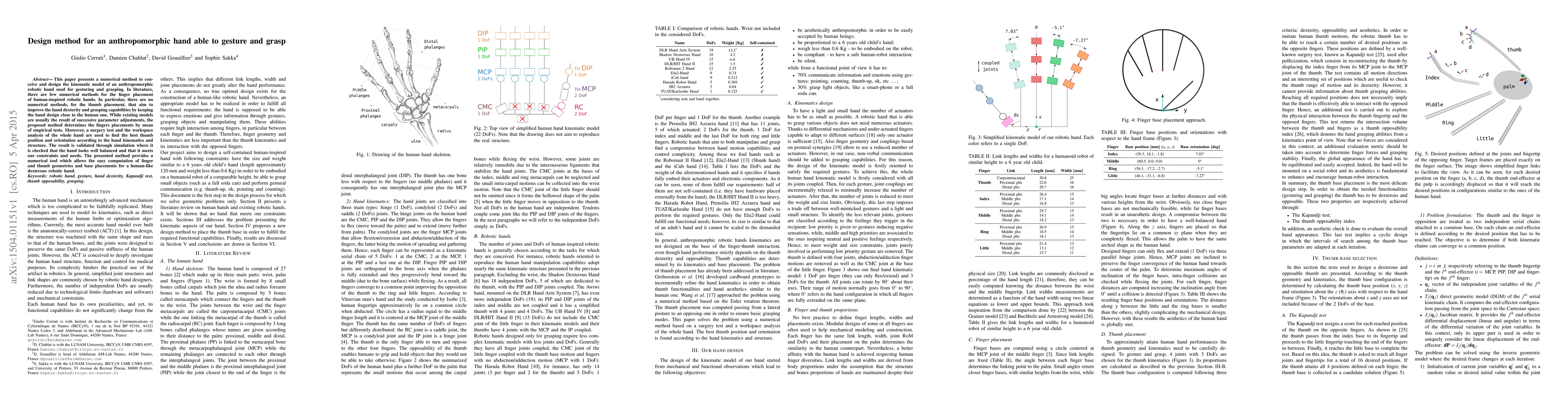 This paper presents a numerical method to conceive and design the kinematic model of an anthropomorphic robotic hand used for gesturing and grasping. In literature, there are few numerical methods for the finger placement of human-inspired robotic hands. In particular, there are no numerical methods, for the thumb placement, that aim to improve the hand dexterity and grasping capabilities by keeping the hand design close to the human one. While existing models are usually the result of successive parameter adjustments, the proposed method determines the fingers placements by mean of empirical tests. Moreover, a surgery test and the workspace analysis of the whole hand are used to find the best thumb position and orientation according to the hand kinematics and structure. The result is validated through simulation where it is checked that the hand looks well balanced and that it meets our constraints and needs. The presented method provides a numerical tool which allows the easy computation of finger and thumb geometries and base placements for a human-like dexterous robotic hand.