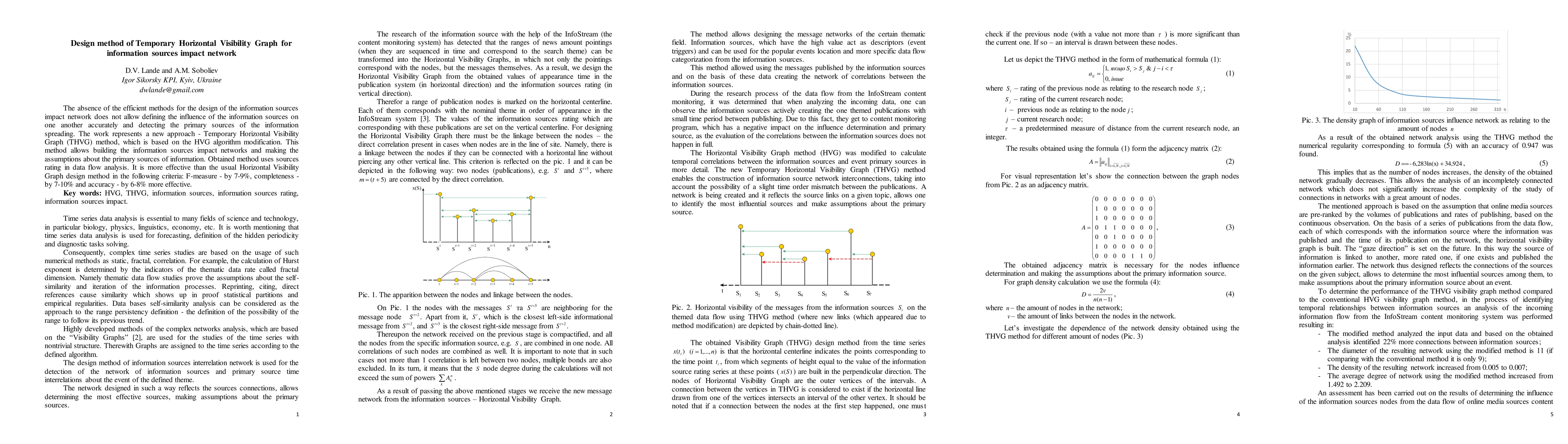 The absence of the efficient methods for the design of the information sources impact network does not allow defining the influence of the information sources on one another accurately and detecting the primary sources of the information spreading. The work represents a new approach - Temporary Horizontal Visibility Graph (THVG) method, which is based on the HVG algorithm modification. This method allows building the information sources impact networks and making the assumptions about the primary sources of information. Obtained method uses sources rating in data flow analysis. It is more effective than the usual Horizontal Visibility Graph design method in the following criteria: F-measure - by 7-9%, completeness - by 7-10% and accuracy - by 6-8% more effective.