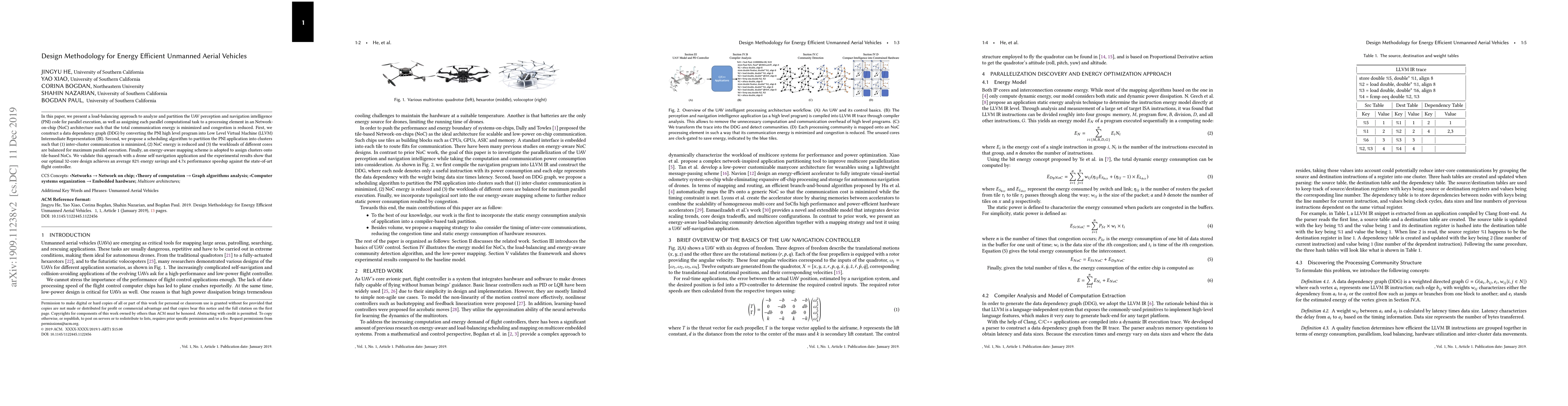 In this paper, we present a load-balancing approach to analyze and partition the UAV perception and navigation intelligence (PNI) code for parallel execution, as well as assigning each parallel computational task to a processing element in an Network-on-chip (NoC) architecture such that the total communication energy is minimized and congestion is reduced. First, we construct a data dependency graph (DDG) by converting the PNI high level program into Low Level Virtual Machine (LLVM) Intermediate Representation (IR). Second, we propose a scheduling algorithm to partition the PNI application into clusters such that (1) inter-cluster communication is minimized, (2) NoC energy is reduced and (3) the workloads of different cores are balanced for maximum parallel execution. Finally, an energy-aware mapping scheme is adopted to assign clusters onto tile-based NoCs. We validate this approach with a drone self-navigation application and the experimental results show that our optimal 32-core design achieves an average 82% energy savings and 4.7x performance speedup against the state-of-art flight controller.