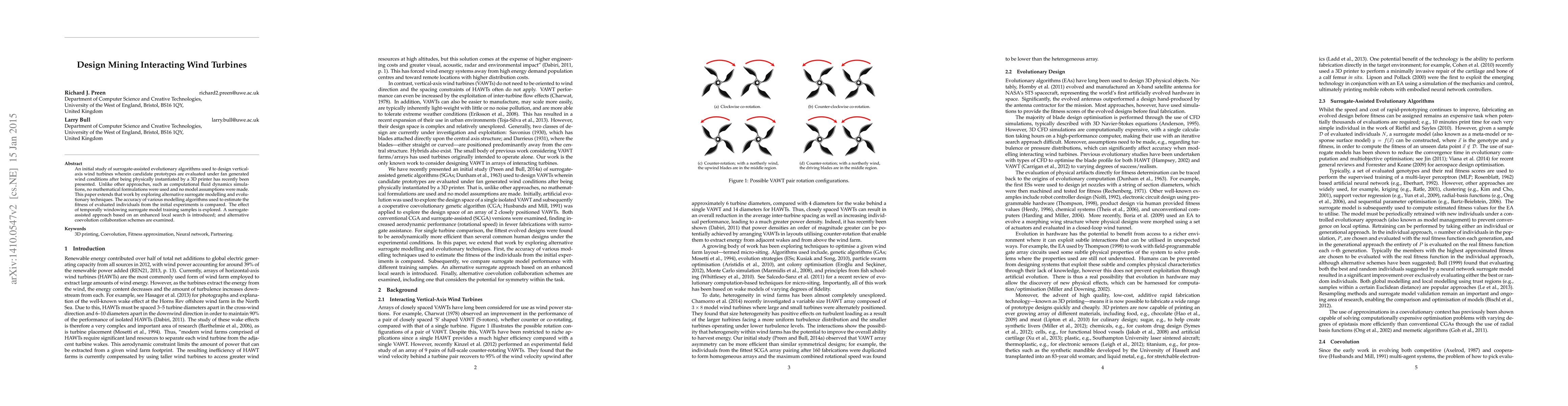 Researchers explored alternative methods for designing vertical-axis wind turbines using surrogate-assisted evolutionary algorithms, comparing modeling accuracy and training sample windowing effects. They also introduced a new approach based on an enhanced local search and coevolution collaboration schemes.